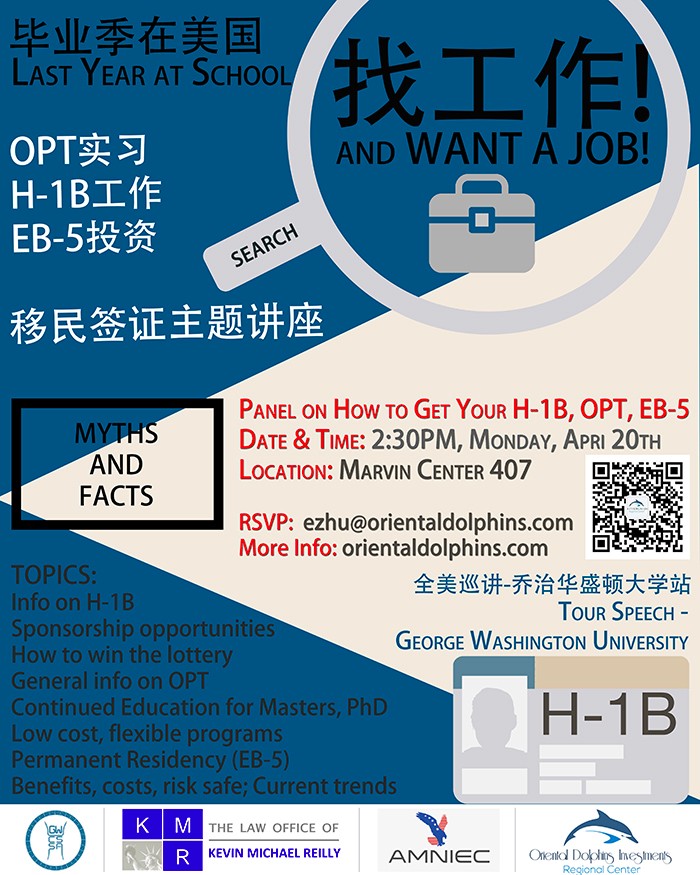 “毕业季在美国”OPT, H1B, EB5主题讲座,是由美国著名律师事务所THE LAW OFFICE KEVIN MICHAEL REILLY和各大高校CSSA联合主办,美国国家移民与教育中心和东方海豚投资移民公司赞助协办。本次讲座覆盖全美各大高校,历经普渡大学,密苏里大学,伊利诺伊香槟分校,加州大学伯克利分校,卡内基梅隆大学,乔治梅森大学,终于来到了乔治华盛顿大学。