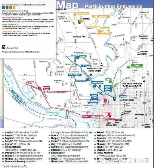 本周六(5.9日)10:00AM到4:00PM是欧盟使馆开放日,共有28个欧盟国家参加此次活动。该项活动是华盛顿地区非常火爆的一项文化活动,小黄人根据DC吃喝玩乐群的群友往年的经验和使馆开放日今年的官方网站介绍,给出以下的欧盟使馆开放日全攻略。 首先必须写在最前面强调的是欧盟使馆开放日是极其火爆的一项活动,如果你觉得上周走遍世界使馆开放日人已经多的让你无法忍受的话,劝你果断放弃欧盟使馆开放日的活动。另外本周六气温异常炎热,如果带着老人和孩子无法忍受炎热和大队的话,也建议您趁早放弃。由于排队时间过长,如果参加,请一定穿一双舒服的鞋子,切记切记! 由于参与人数太多,所以想在一天之内逛完这28个国家的使馆是完全没有任何可能的,请大家在临行之前仔细研究地图,确定一下自己想去哪个方向,不要贪多,以免排队排死。热门使馆排队排上一个多小时都是很正常的事情,请大家一定要有心理准备。如果能早去的尽量早去,起码可以节省一点排队时间,也不至于那么热。下面是这次使馆节的地图和shuttle标示: 以下是往年欧盟使馆开放日DC吃喝玩乐群网友的总结,今年的活动很可能有不同,所以以下内容仅供参考: 德国:今年法国使馆关闭,德法两国合办的活动在德国使馆举行。德国使馆是很受欢迎的一个场馆,卖啤酒香肠,有手风琴表演,画脸师傅很棒(今年仍旧有免费画脸活动),往年曾经送过真丝领带。 法国:往年有马车,吃的也不错,为使馆节的大热,往年曾经送过法英词典。 比利时:啤酒巧克力都发,不过没什么活动所以没有照片。 丹麦:给小朋友发乐高,但是如果去晚了没领到会比较无聊,室内只有自行车展出。 意大利:有精彩的高跷表演和意大利合唱团表演以及豪车展示,游客还可以进车里去体验,也是一个非常精彩的使馆。馆内卖的提拉米苏味道不错,但是排队的人很多。 英国:占地面积很大,展出内容颇多(有豪车),有歌剧演出,有人教踢足球,去年还送游客伞 克罗地亚:可以品尝干红和柔红,有音乐演出和绘画展览 爱尔兰:有踢踏舞演出 荷兰:开放大使的住宅,很漂亮,大使出来跟大家见面,但是不能照相。 芬兰:使馆是清一色的疯狂小鸟 一个另类的推荐是马耳他大使馆,推荐的主要原因是基本不排队,大使亲自出来迎接,随便拍照,有一点吃的。但是非常小,两层楼10分钟就逛完了。 感谢DC吃喝玩乐群的花农以及技术支持等朋友为本文提供精彩绝伦的照片,下面是一些其他使馆节活动的照片: 同时本人还简单翻译总结了今年使馆节官方主页给出的各国活动,活动具体宣传请点击本篇文章左下角的“阅读原文”,即可查看该活动官方网页,点击官网右下角可以下载本次活动的地图和宣传单。 拉托维亚(Latvia):有舞蹈演出,和知名作家见面活动以及画展 立陶宛(Lithuania):没有具体说明有什么活动 卢森堡(Luxembourg):有展台展出传统瓷器 马耳他(Malta):有自制甜品和历史文献展出 荷兰(Netherlands): 有食品试尝,还可以带孩子玩荷兰的传统游戏 波兰(Poland):有大使馆主厨提供的食品品尝 葡萄牙(Portugal):葡萄牙制品展和摄影展 罗马尼亚(Romania):有当地食品饮料提供,还有民族舞蹈表演 斯洛伐克(Slovakia):音乐舞蹈表演,传统乐器展示,传统饮料和食品品尝,可以见该国的大使,还有有关这个国家知识的测试(有奖品) 斯洛文尼亚(Slovenia):没有具体说明有什么活动 西班牙(Spain):有酒喝Tapas品尝,有介绍西班牙的艺术和文化的活动 瑞典(Sweden):有活动,但是具体是什么活动没有说 英国(United Kingdom):有食品品尝,艺术展示还有适合家庭的活动 欧盟(European Union Delegation):送特制的行李箱tag,有给孩子活动的区域,送巧克力钱币 奥地利(Austria):可以见奥地利大使,可以尝奥地利酒,观看厨师如何做传统苹果点心 比利时(Belgium):可以品尝啤酒,巧克力和华夫饼,在facebook上回答问题可以赢取丁丁漫画书 保加利亚(Bulgaria):有民族歌舞表演和传统食物饮料品尝 克罗地亚(Croatia):可能有品酒 塞浦路斯(Cyprus):有传统食品饮料品尝,放纪录片介绍这个国家 捷克(Czech Republic):古典摩托展示,警犬表演,有食品饮料提供 丹麦(Denmark):可以玩乐高骑自行车 爱沙尼亚(Estonia):有知识测试,可以赢取两人六日爱沙尼亚旅行 芬兰(Finland):有传统食品提供 法国(France)和德国(Germany)今年在德国大使馆联合展示:有食品品尝,有人给游客画脸,还有很多其他活动 希腊(Greece):歌舞表演,照片展出 匈牙利(Hungary):歌舞演出,食品品尝 爱尔兰(Ireland):有什么活动没有说 意大利(Italy):有食品品尝,展出,歌舞和游戏。