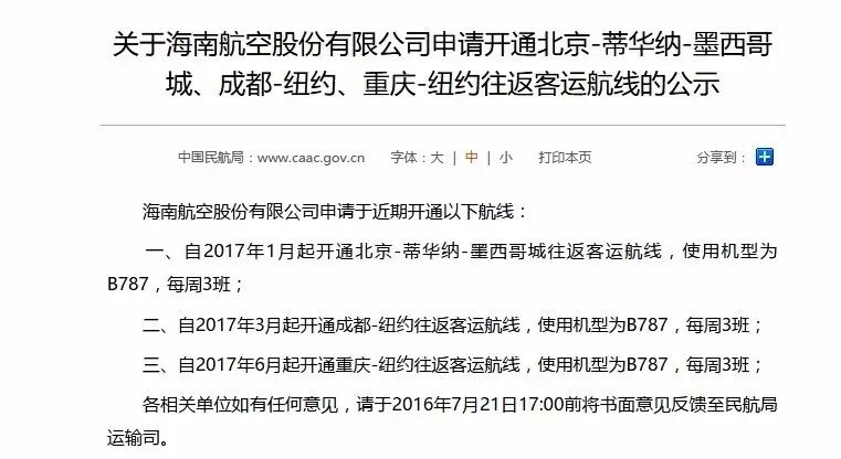 成都直飞纽约来了!重庆直飞纽约也来了!“787战队”海航双飞战略real牛!好消息好消息!各位川渝的飞客还没睡嘛!嗨起来~~ 中国民航局14日下午发布的航线申请公示显示:海南航空申请自2017年3月开通成都至纽约往返客运航线。一旦该航线开通,成都直飞纽约空中飞行时间有望缩短在14-15个小时以内,咱们再也不用去北上广转机啦。 成都直航纽约之后也将是中西部地区首条飞往美国东海岸的航线。而且哦,成都到纽约距离大概是12091.8公里,这也是成都史上飞行距离最长的一条航线。
