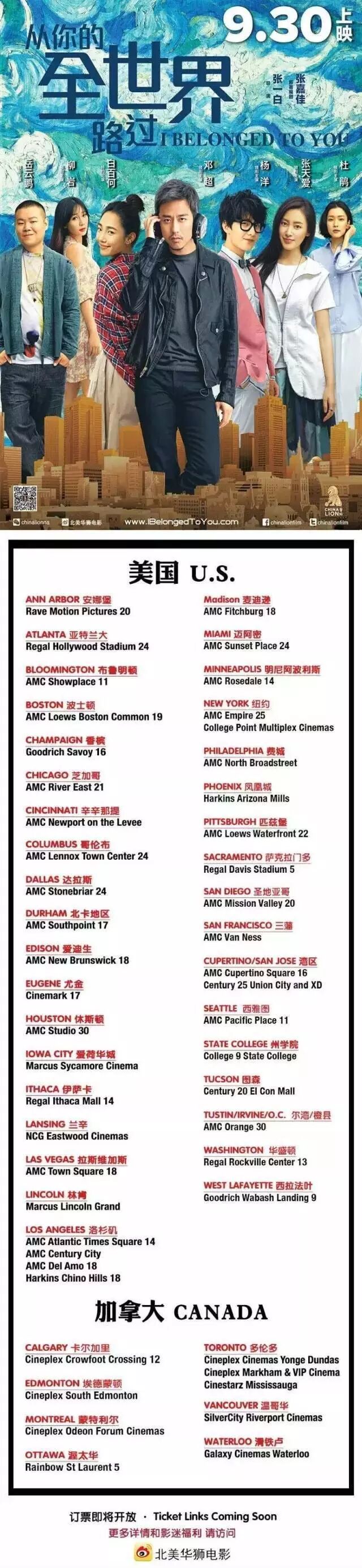 华府华语电影 | 国庆必看的《从你的全世界路过》北美930暖心上映Washington DC Area Regal Rockville Center 13 9月30日首映 【终极预告】 2013年 一个号称“全世界最会讲故事的人” 写了本短篇故事集 风靡了整个微博 一个个真挚简短的故事 慰藉了漂泊孤独的都市男女 那本书里说 对这个世界绝望是轻而易举的 对这个世界挚爱是举步维艰的 —— 动心的一瞬间,万物复苏 什么都奔向欢喜 —— 我希望有个如你一般的人 贯彻未来,数遍生命的公路牌。 ——张嘉佳 《从你的全世界路过》 2016年9月30日 同名电影《从你的全世界路过》来了 —— 编剧张嘉佳 原著作者,金马奖最佳编剧提名 导演张一白 带来《将爱情进行到底》《匆匆那年》的青春电影教父 演员超一线阵容 邓超、白百何、杨洋、张天爱、岳云鹏、杜鹃、柳岩 9月30日 北美暖心上映 剧情 过气电台DJ陈末和两个好兄弟——‘全城最傻’的猪头和‘全城最纯’的茅十八在横冲直撞的生活里面临的人生最大的转折点:陈末遇见神秘的幺鸡,猪头打造惨烈的婚礼,茅十八经历最悲伤的别离,梦想、爱情、友情都受到极大的考验。当这群人的生活一点点崩塌之时,往事也一点点被揭开。 —— 3对都市男女的爱情故事 初恋-表白-执着-温暖 不同世界的人 终会相遇 终会相爱 却在傲慢与偏见中错失爱情 只能从彼此的全世界路过 陈末(邓超)X 幺鸡(张天爱) 全世界拼成首诗,我爱你当作最后一行。 陈末与幺鸡的相遇,是灰暗里的微亮,是擦肩后的回眸,在绝望中生长出希望。无论故事结局如何,幺鸡环抱陈末靠在他肩膀上的这一刻,仿佛全世界都静止了,无畏路过,此刻,已是永恒。 茅十八(杨洋)X 荔枝(白百何) 我希望有个如你一般的人,贯彻未来,数遍生命的公路牌。 “荔枝,你可以嫁给我吗?”才一句话,后半句就哽咽了。没有梦想的发明家茅十八爱上女警花荔枝后,他的梦想就是用一辈子的智商来宠她。不路过,愿单膝下跪的这一刻,定格成永恒。 猪头(岳云鹏)X 燕子(柳岩) 世事如书,我偏爱你这一句,愿做个逗号,呆在你脚边。 “全城最傻”的猪头愿意为燕子对抗全世界……你是否也有这么一刻,爱上一个人,好像突然有了软肋,也有了铠甲!猪头牵起燕子的手,时光在这一刻变成永恒。 七个不同人物出现 各自抒发了对爱情的呼喊 “我只是想离他近一点” “我只是想给她一个家” “好好的爱情,怎么就变成自作多情了?” “女人究竟想要什么,你们说得出来吗?” 影片取景也是书中故事的发生地——重庆 如果说《火锅英雄》展示了重庆野性蓬勃的张力 这次张一白就拍出了 重庆的温情和烟火气 完美还原著中的 那个容纳每位饮食男女的都市 “一个人的记忆就是一座城市,时间腐蚀着一切建筑,把高楼和道路全部沙化。如果你不往前走,就会被沙子掩埋。所以我们泪流满面,步步回头,可是只能往前走。” 看阳光男神杨洋一改以往风格饰演呆萌理工男,搭配“票房女王”白百何,化学反应出初恋般青涩的感觉; 看张天爱跳脱出《太子妃》霸道女王的形象,在剧中默默的为邓超饰演的陈末守候,无不让人为之怜惜; 看小岳岳那张自带特效的脸搭配女神柳岩也驾轻就熟,这场戏小岳岳达到了爱情片的最高境界,成功的让观众体会到乐观喜气的他对于爱情背后的那份隐忍。 ▼ 世上有多少情侣, 从彼此的全世界里经过, 最后却依然不能再拥有 从此各自天涯 所以这部“完美IP改编”的超一线阵容电影 你不能再错过 ▼ 【终极预告】 |
