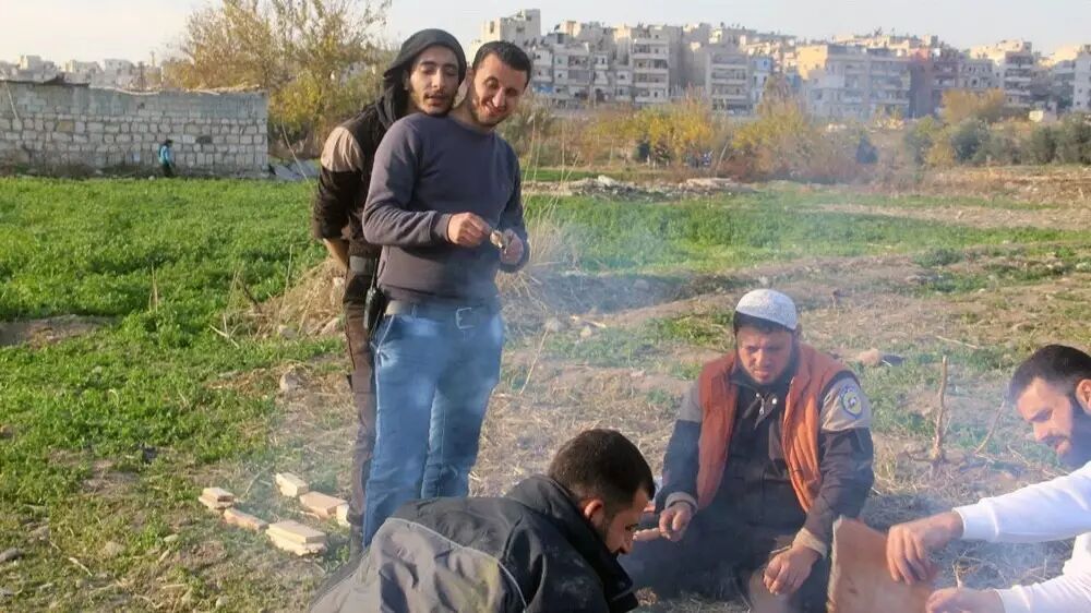 ▍照片于春天时在哈立德的房子附近拍摄。图中白盔志愿者在烧烤,其中哈立德头戴白帽坐在地上,易卜拉欣身穿牛仔裤站着。[照片由易卜拉欣·哈吉提供]