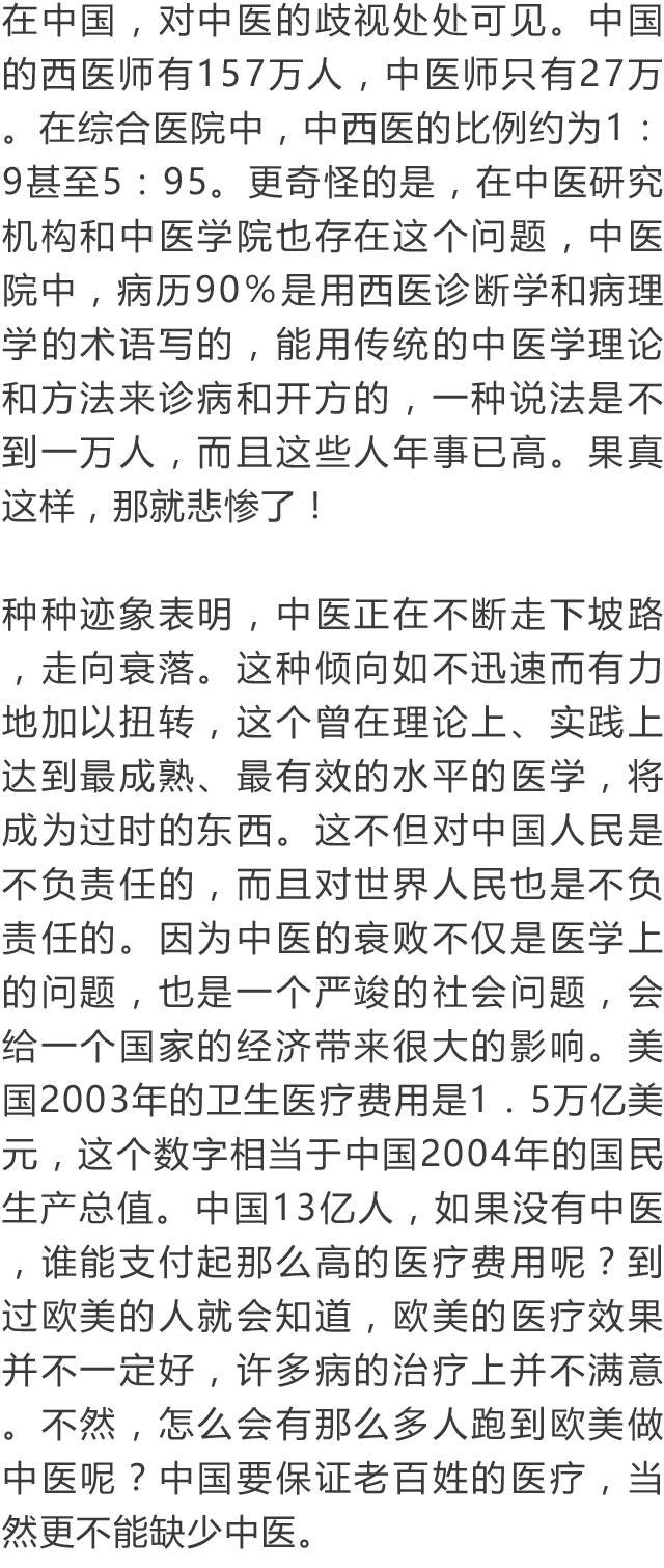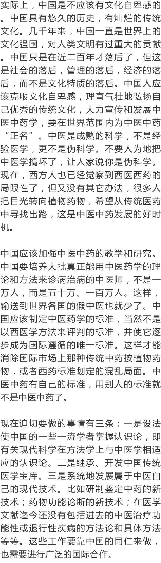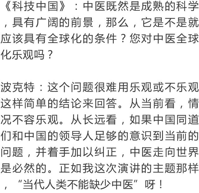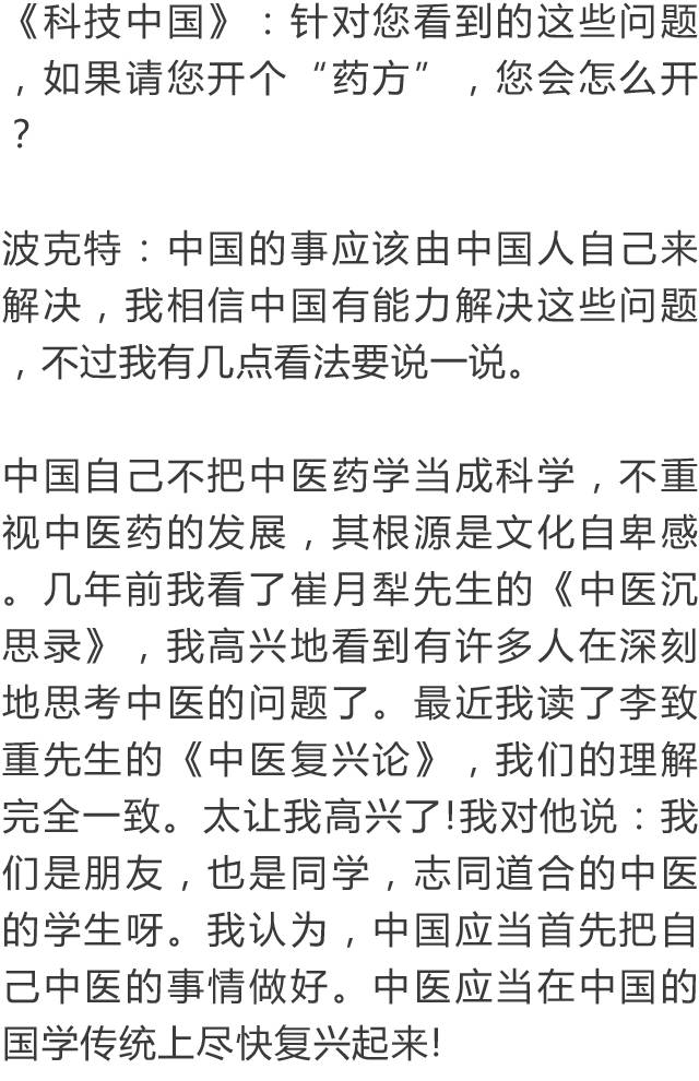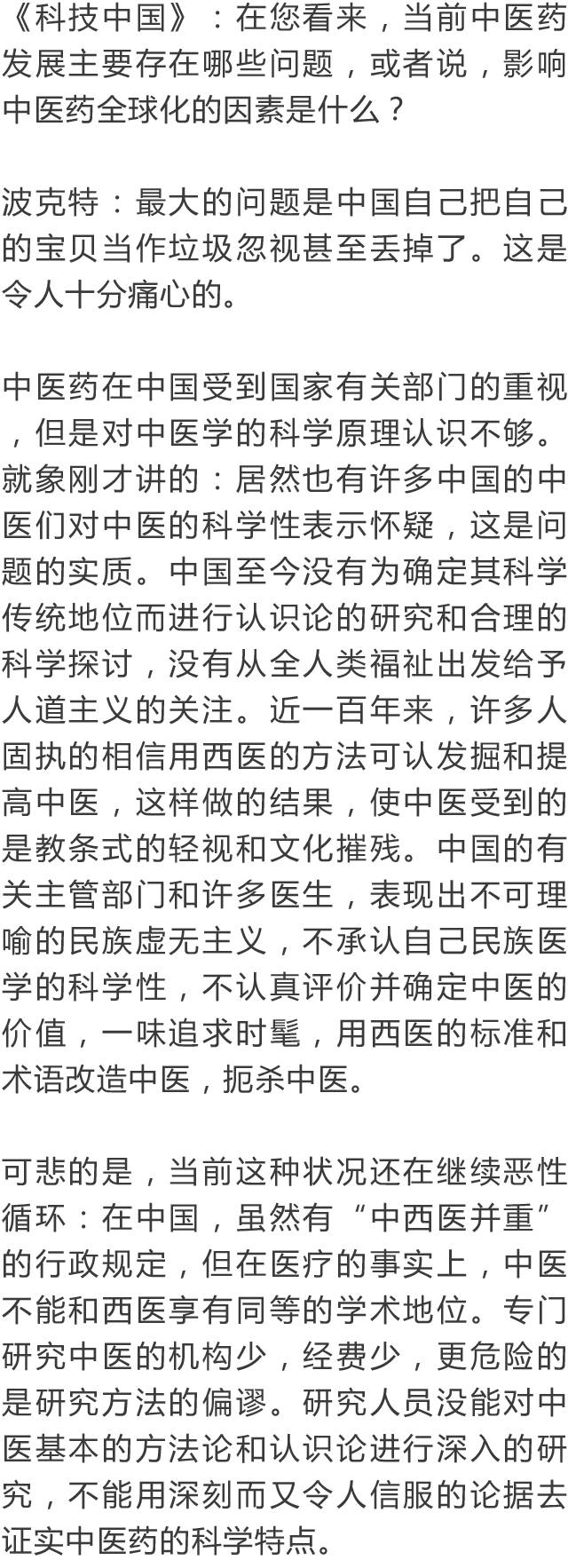 德国大学教授如此评价中医,令无数中国人汗颜!作者:郑恩元 来源:科技中国 在数千年的中华民族发展史中,中医药为我中华民族的健康和生息繁衍做出了伟大的贡献。可以说,中华民族之所以现在是全世界人口最多的民族,中医药功不可没。无论方舟子等人如何反复诋毁中医,都不能磨灭中医对世界的文化价值。 中医是成熟的科学——希望中国不要培养假中医 曼福瑞德·波克特(Manfred Porkert),一位谦和友善、年逾古稀的德国老人,一位受人尊敬的汉学家。他给自己起了个中国名字:满晰驳,取意为“以饱满的责任感反驳西方明晰科学的不足”。他曾任德国慕尼黑大学东亚研究所所长,在欧洲,他不仅是与李约瑟齐名的汉学家,而且是一位中医学家。他的名片上印着:“德国慕尼黑大学汉学、中医理论基础教授”, “中国中医科学院、国际中医规范辞典执行主编”。 他精通德文、法文、英文、拉丁文以及俄语等,中国话讲得相当不错。他的藏书甚丰,收藏的中文书籍有近万册。四书五经,老子、孟子,唐诗宋词,红楼、水浒,以至平妖传,大同书无不研读。他读更多的,还是包括《黄帝内经》、《本草纲目》在内的诸多中医典藉及现代中医著作。 在40多年的教学与研究中,他编著出版中医图书有:《中医临床药理学》、《中医方剂学》、《中医针灸学》、《中医论断学》、《中药学》、《中医基础理论》。其中他的《中医基础理论》一书,风靡欧美,被译成多种文字,并多次出版。他在德国慕尼里创办过“国际中医社团”,开展专题研究,并多次在世界各地举办学习班、报告会、学术交流会。数十年里,矢志努力,耕耘不懈。 他为了中医的振兴和发展,1979年以来先后5次来到中国。他的中国同事和朋友亲切地称他“老满”,或“满教授”、“满先生”。有人把他誉之为活着的白求恩。他对中医发展的观点,被国内学者广泛引用。 前不久,波克特教授应邀来北京。在中国科技信息所主办的“中医药发展战略研讨会”上,他作了《为什么当代人类不能缺少中医》的专题讲演,受到与会者的广泛认同和高度赞扬。会后,他接受了记者的专访。 希望中国不要培养假中医 《科技中国》:满教授,您在讲演中说:没有中医,我早就不存在了。是您把中医药学研究当作终身事业,视为生命一样重要呢,还是中医药使您的健康大受裨益,甚至挽救过您的生命呢? 波克特:应该说,这两个含义都有。早在50年代,我就被中国传统文化深厚的底蕴征服了。我结识了不少华人朋友,并向他们学习汉语。在巴黎大学求学,有幸结识了李约瑟博士,更加深了我对汉学的兴趣。我的博士论文就是关于《道藏》的研究。取得博士学位后,又回德国学习西医,同时研读了南京中医学院编著的《中医学概论》。从此我与中医结下了不解之缘,当作了我一生最主要的事业。 作为中医学家,我当然知道中医的保健方法,并在实际中广泛应用。有一年外出受寒,肩膀疼得很励害,下飞机后胳膊都抬不起来了。开始时用西医方法治疗,很久不见效果。后来我改用艾灸,三次就完全恢复了。1989年,我患了膝关节炎,西医先让服用可的松,没有效果,后来建议动手术,换金属关节。一位姓周的中医师给我推拿、针灸,配中药吃,不到6个月,彻底好了。你看见我今天在会上,两个多小时都是站着讲演的吧,完全正常。两年前,我的眼睛视物模糊,西医说是中心性渗出性视网膜炎,没有办法治,搞不好会失明的。读书人眼晴失明是最可怕的事,我用中医方剂学里的伏兔丹(正确的写法应为:茯菟丹)和六味地黄丸为基础,做成药粉来吃,几个月后就好了。现在我73岁了,视力1.5,你看,我的眼睛不是好好的吗? 《科技中国》:您的太太和家人、朋友,是不是也相信中医,有病时是不是也请中医师来看? 波克特:当然!我这次来北京,从王府井的平心堂给我的太太配了中药散剂,还要带回一些在欧洲不便买到的中成药呢! 《科技中国》:听说您能用中医诊病,并能开中药方? 波克特:当然。我研究中医药几十年了,60年代时曾经拜台湾一位老中医为师,他的脉诊很特别,诊断不错。我也是个满不错的中医师啊。 《科技中国》:在德国,认可中医中药的人多不多? 波克特:德国是使用植物药最多的欧共体国家,占领了欧洲草药市场的70%左右。据调查,58%的德国人服用天然药物,85%的德国人认为天然药物有效,毒性低。可是现在到德国和其他欧美国家的中医师,大多数水平不高。有的人到中国进修中医几年甚至几个月就开中医诊所,真正能用中医理论和方法诊病治病的中医师不多,许多中医师不会望闻问切。他们其实是假中医。中医是一门科学,希望中国要严格掌握培养标准,不要培养这样的假中医,这对中医在世界的传播影响很不好。真正好的中药也不容易买到,有些还是从其他国家进口的,药效得不到保证,这很影响中医药在国外的声誉。 中医是成熟的科学 《科技中国》:您在各种场合都说过,中医是成熟的科学。我们相信这是您对中医药学多年研究和深刻理解的结果。在您看来,中西医是不是各有所长,它们各自的长短主要是哪些? 波克特:这是个很有意思的问题,我要多说一点。国外是有许多人认为中医不科学。奇怪的是,居然也有许多中国的中医们对中医的科学性表示怀疑。我在世界许多地方讲演,我一再强调中医是一门成熟的科学。这是我几十年研究而得出的结论。 什么叫科