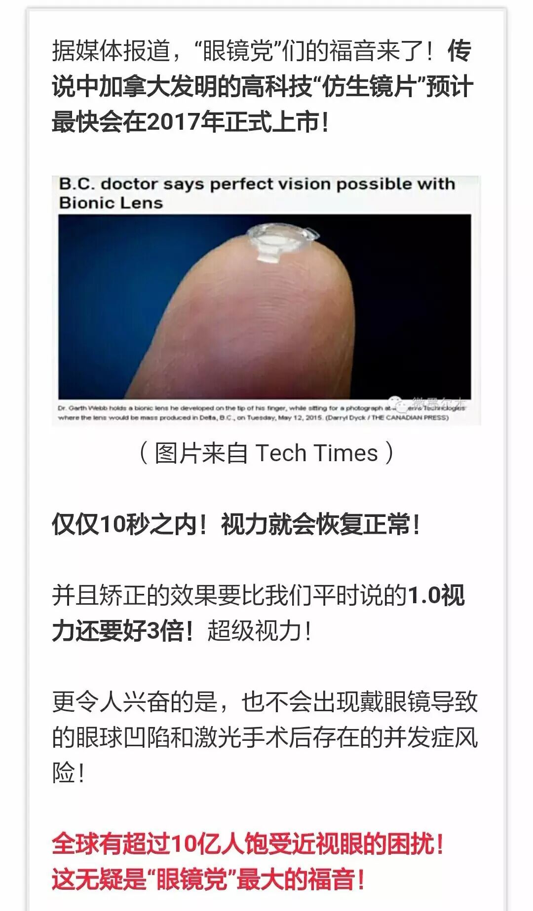 此物一出,地球上再无近视眼?这是真的吗?这两天 朋友圈被这样一条微信刷屏了 说:不用多久,近视眼将被消灭!? 姥姥也收到来自社会各界的问候 不对,是咨询 大部分都是近视小朋友的家长 那么,这个消息是否属实 姥姥在这里做一次统一回复 让我们开始吧 Let's go ﹀ ﹀ ﹀ 其实,新闻中提到的技术并非“空前绝后”,与之相似的技术早在2005年就已出现,并且在全球60多个国家进行了50万例。 丨这项技术就是 ICL (以下内容取自Wikipedia) 可植入式隐形眼镜 ICL,Implantable Contact Lens 是一种胶原聚合物材料制成软弹性凝胶镜片。 ICL手术可以替代LASIK在屈光手术中用于纠正近视。它备受欢迎的原因在于手术不切除眼角膜组织,并且能够产生高质量的视觉效果,是一种高端的近视眼矫正方案。 1953年,意大利医生BenedettoStrampelli首次成功地在眼前房植入了人工晶体来纠正近视。然而,此前房型人工晶体临床试验中发现一些并发症,包括角膜内皮细胞的缓慢流失、虹膜收缩以及周边前房粘连和瞳孔成椭圆形等。 1986年,费奥多罗夫设计了第一个后房型人工晶体,从而消除了大部分并发症。 现在使用最广的后房型有晶体眼中,人工晶体是由STAAR Surgical公司生产制造的Visian ICL V4;2005年获得了美国食品和药物管理局(FDA)的批准;目前在全球被30万用户使用。 ICL手术 手术是在局部麻醉的情况下进行的,整个手术过程患者保持清醒状态。ICL优越性在于其采用独特材料胶原聚合物,它能够灵活地将被绕成卷并推注到ICL专用注射器的尖端,然后通过一个很小的切口(2.2毫米)植入到眼后房。这个过程通常不超过十分钟。手术后,患者能够立刻恢复视力,通常完全康复的时间为1-2天。 丨姥姥想到一个通俗的栗子:很像隆胸手术 ICL与LASIK(准分子激光手术)区别 国内更为常见的屈光手术为LASIK(准分子激光手术),通过改变角膜的屈光力来提高视力。LASIK手术和ICL的区别就在于,LASIK是在眼角膜(Keratoconus)上进行手术,而ICL是在保持角膜结构的情况下,在眼后房插入晶状体。 如果视力在以后随着年龄的增长有所变化,那么ICL可以取出或者是替换,而LASIK手术则不能恢复已切除的角膜组织。 适宜人群 1.屈光稳定的成年人 2.屈光度200到2000。 不适人群 1.未成年人 2.患者荷尔蒙不稳定的人群如孕妇、哺乳期的妇女等,她们屈光度不稳定的可能性更大,因此术前应和医生讨论。 3.如患者自身患有免疫性疾病或免疫缺陷状态如糖尿病等。以及正在服用的一些药物(如维甲酸和类固醇),那么这些情况都有可能妨碍眼内治疗手术的疗效。 4.眼创伤。 后遗症 任何医疗手段都存在着一定的风险,ICL的风险是引起初期白内障。 先别忙高兴 你是不是应该问一下价钱呢? 在疯传的那条微信中,称这样的手术大约花费(折合成人民币)6739元。然而并不是! 姥姥的调查发现,花费可能远不止这些—— 美国Dr Shop网站(很像中国的春雨医生)上介绍,单单一片(单眼)ICL镜片的价格约为1500~5000美元,平均为3500美元,这还不包括检查费用以及复查的费用。 随后姥姥拨通了上海仁爱医院的咨询热线 因为该医院的官网宣传可以实施ICL手术 咨询结果如下 姥姥:我想咨询一下网上说的人工晶体植入治疗近视。 护士:您近视多少度呀? 姥姥:一个900一个750(完了,暴露了) 护士:这个度数可以考虑做激光呀,晶体植入我们一般建议高度数才做。(这个度数还不算高,这是在夸我吗?) 姥姥:可是网上说这个比激光安全嘛。 护士:这个费用有点高啊。 (费用高不是收益高吗,怎么反而不推荐呢?莫非这就是传说中的“业界良心”?) 姥姥:费用我可以接受。(姥姥有钱!) 护士:哦,您稍等一下。(给姥姥听了一段电子音乐) ... 护士:这个费用的话大约在单眼一万五左右。 姥姥:好的,谢谢。 看来,即使已经开展这项手术的医院 也未必很拿他当回事儿 ... 为什么一项存在已久的技术 在朋友圈掀起如此大的波澜呢? 那是因为出现了更天马行空的设想 号称人类可以拥有超人一样的视力 近期这则新闻的主角是:Garth Webb 现任加拿大 Ocumetics 科技公司的CEO。 在TED演讲中,Garth Webb是这样介绍自己的 (以下内容翻译自Garth Webb的TED演讲) 我4岁的时候立志成为一名职业牛仔。可是到8岁的时候就因为视力问题而戴上了眼镜;显然,眼镜和牛仔很不般配(这是歧视戴眼镜的牛仔吗),从那以后我对眼镜就特别憎恨!于是,我修正我的志向,成为了一名验光师。(这不科学啊) 25年前,近视激光手术被发明了,我说:哇哦,近视问题可以解决了。 但其实,人类的眼睛里还有一组镜片,他们会不断的发生变化,使得你的视力再次出现问题。这让我萌生了研究仿生镜片(Bionic Lens)的想法。 终于,我们有了突破。 只要将比指尖还小的仿生镜片植入眼内,就可以矫正视力并且提高到正常视力的3倍;和照相机镜头十分相似。(不过,截止目前,包括该公司官网上都没有公布产品背后的原理是什么,同时也找不到任何患者的证言) 不仅如此,未来我们的镜片还可以与手机相连;你可以将你看到的景象与全球千千万万人分享。(听起来是GoogleGlass的眼内版) 以上内容翻译自Garth Webb的TED演讲 并非作者观点 2015年5月,英国BBC NEWS报道了这项“黑科技”, 顿时引起轩然大波,全球媒体纷纷报道 这里介绍其中一家 ▼ 主持人的报道全部援引厂家的官方内容以及BBC等其他媒体的评论。换句话说,其实他们既没见过产品,也没采访过发明人、眼科医
