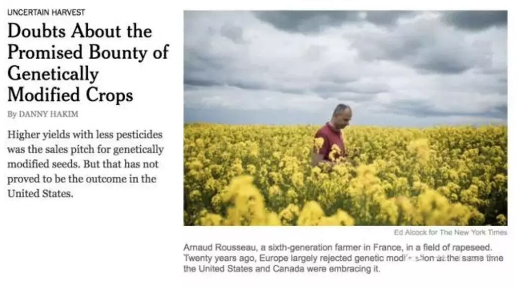 《纽约时报》的记者使用联合国、美国政府、欧洲政府、相关研究机构的数据,比较了二十年来,大量使用转基因品种的美国和加拿大,与不使用转基因种子的西欧国家的农业发展情况。分析数据后,记者发现,北美在增产和减药方面都落后于西欧国家。