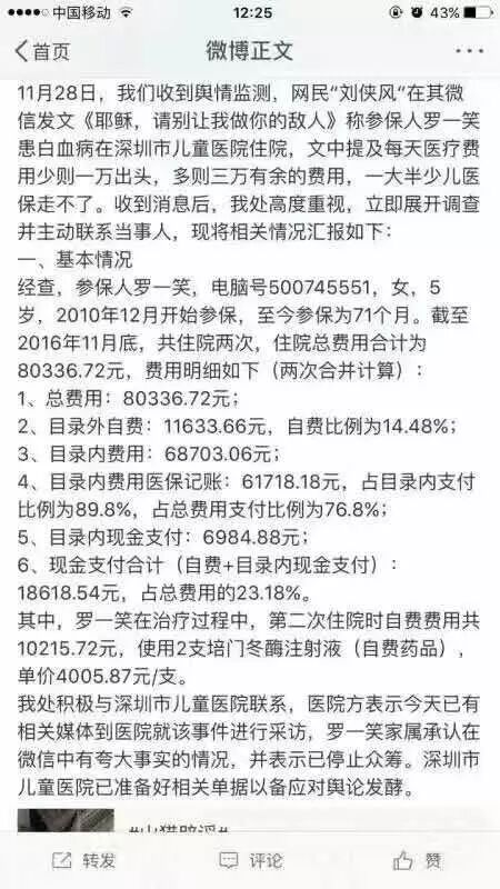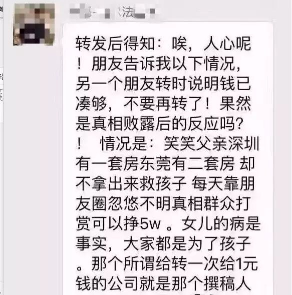 罗尔:营销号你给我站住!——揭开罗尔“骗捐”的真相罗尔为了患白血病的女儿,与营销公众号一起共获得超过200万元善款的之事刷爆了全国的朋友圈。 剧情在短短的四五个小时出现了反转,从最初的痛心唏嘘,到有人踢爆罗尔有三套房两部车(实际是一部车),医保报销比例也达到80%,一众吃瓜群众先愕然,然后骂声不绝。 这件事,恰好我曾经参与,也曾经问过罗尔。对于公众号运作的流程也非常熟悉,也就必须出来说两句。 当事人罗尔的女儿笑笑 罗尔起初并没有去刻意渲染女儿的病情,我和他同在一个媒体群里,他也没有在群里广为发布,只是自己公众号写过女儿病情,也没有呼吁过捐助。 罗尔本人 我对他只知道名字,并不熟稔,也没加过好友,直到11月27日夜,女儿同学的妈妈突然给我发来一则《耶稣,请别让我做你的敌人》(也就是小铜人公众号为罗尔所做的那篇推广爆文),请我帮助核实真伪。我即刻添加罗尔为好友,得到真实的回应后,询问罗尔为何不走腾讯公益?罗尔回答:“朋友的公司需要宣传,我需要钱,正好一拍即合,彼此都没有太大亏欠。去腾讯公益,就会占用其他人的机会,所以,我一直没答应。”第一反应是罗尔要面子,试探着问罗尔能否接受我的援助,转了一个红包给罗尔。他也接受了。其后,我和女儿同学妈妈转达:事情属实,但不要向P2P观察的公众号捐款,要她直接向罗尔的公众号打赏。 这个事情没有引起我的怀疑,一,罗尔同在深圳媒体群里,早知道他的真实身份,是女报的杂志主编;二,知道深圳女报今年停刊,他们应该日子不好过。但对这个公号强调转发一次就捐给罗尔一元钱是非常不喜欢,知道是公号涨粉的套路。 但完全没有想到的是,今天上午剧情出现了大反转。先是有署名“via张雨丝”的帖子曝光他离婚,后来又娶了老婆,装修后住进去,生了这个女儿,暗示白血病怎么来的。再揭露罗尔在深圳东莞有三套房。我还为其辩解:离婚和捐不捐没有关系。离婚了财产分割后,怎么也不会再拥有三套房。我又到微信再去找罗尔,让他出来说几句回复,也没有得到回应。 此时,又有一份舆情监测的微博蹦出来,写明罗一笑住院花费多少,社保比例报销80%,自费部分只有2万多。 这就引起了我的注意了,相对于沸沸扬扬的指责罗尔骗捐。 我只关心两个问题:1.少儿医保的报销比例是多少?罗一笑小朋友的自费部分是多少?2.罗尔的经济实力究竟如何? 第一个问题,旋即得到了回应。儿童医院的帖子,说明罗一笑小朋友自费部分3.6万,三次住院共花费20余万元。 11月30日下午16:32分,深圳市儿童医院就关于深圳罗某笑小朋友医疗救治进行情况通报: 近日,朋友圈一篇名为《耶稣,请别让我做你的敌人》的文章引发了社会各界广泛关注,许多爱心人士为孩子捐款,社会各界对罗某笑患儿的病情及治疗费用非常关心。现将罗某笑治疗情况及治疗费用通报如下: 一、关于罗某笑病情及医疗救治情况 患儿罗某笑,5岁11个月,于2016年9月在深圳市儿童医院血液肿瘤科确诊急性淋巴细胞白血病,2016年9月、10月、11月三次入院接受化疗。11月7日入院后,在治疗期间患儿出现发热、气促、心率快,黄疸逐渐加重等感染征象,于11月23日转入重症医学科(PICU)。目前,患儿病情十分危重,已明确诊断为急性淋巴细胞白血病、严重脓毒症、脓毒性休克、多脏器功能障碍综合征,正在接受持续呼吸机辅助通气、床旁血液透析滤过(CRRT)等治疗。治疗期间医院已多次组织多学科联合查房,开展病例讨论,为孩子制定了详细、积极的治疗方案,与患儿家长一直保持良好沟通。 二、关于罗某笑医疗费用情况 我院严格执行深圳社保及物价部门相关收费政策,罗某笑共住院3次,第一次住院共29天,住院总费用44375.06元,其中医保支付30730.83元,自付13644.23元,自付比例为30.75%(自付费用中包含自费药物2支国产“培门冬酶”共 8011.74元,该药为儿童急性淋巴细胞白血病患者一线治疗用药)。第二次住院共28天,住院总费用35961.66元,其中医保支付30987.35元,自付4974.31元,自付比例为13.83%。前两次住院的医保及自付费用均已结清。第三次住院截至11月29日共22天,住院总费用123907.59元,其中医保支付106332.8元,自付17574.79元,自付比例为14.18%,第三次费用将于出院时结算。 截至11月29日,三次住院总费用合计为204244.31元,其中医保支付168050.98元,自付36193.33元,三次平均自付费用占总治疗费用比例为17.72%。 罗某笑患儿后续治疗费用,会因孩子的病情发展而变化。对急危重症病人,我院将继续贯彻“先救治后交费”原则予以救治,不会因费用问题影响治疗。 三、下一步治疗方案 目前罗某笑患儿病情危重, 11月29日,我院组织正在医院工作的“三名工程”加拿大多伦多病童医院血液专科团队(国际公认血液治疗顶尖团队)对孩子病情进行讨论,专家们肯定了之前的治疗方案,并给出了后续治疗建议。我院将继续组织多学科专家联合开展治疗,包括强有力的抗感染措施,脏器功能保护,如呼吸机、血液净化治疗、营养支持等,尽全力对孩子进行治疗。 我们衷心祝愿罗某笑小朋友早日度过难关。 罗尔的经济实力,一个下午也在不断上演反转,先是有三套房产还有四家公司两部车。最后真实版本:2001年罗尔在深圳买了一套房,当时花了20万。2014年-2015年陆续在东莞买了两套房,总花费100万,没有拿到房产证,要五年之后才能交易,目前每月按揭还贷是5200元,租金收入5