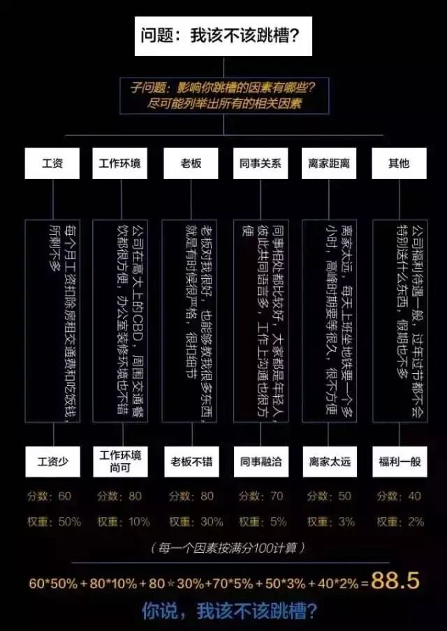 那种一眼就洞穿事物本质的人,是如何思考的? 工作中有一个高效的逻辑思维能力无比重要。它能立刻让你找到问题的关键,让问题引刃而解。简单先说一下我对逻辑思维的理解。逻辑思维的过程,是化繁为简,目的,是找到解决方法。因此,所有和“寻求解决方法”无关的信息,都是无用信息,都需要剔除。 我很喜欢《教父》这部电影,里面有一句话让我记忆至今:花半秒钟就看透事物本质的人,和花一辈子都看不清事物本质的人,注定是截然不同的命运。 举个例子,我在工作中经常会给高层领导做汇报PPT。这种PPT通常需要控制在10-15页以内,因为越高层的人,时间越宝贵,就越需要尽快了解和抓住事物的本质与关键(所以他们才是高层啊!)。底下的人动不动写上十百来页的PPT,没有一个领导愿意看,反而会觉得你工作能力差,废话连篇。一眼就洞穿事物本质的人,能够抢得先机。在别人还在苦苦思索,不得其解的时候,他们已经在分析和解决问题。久而久之,在职场中自然就成长地比别人快了。 下面是我在平时工作中总结的一些提高逻辑思维能力的心得。 1.Be MECE MECE中文意思是相互独立,完全穷尽;起源于麦肯锡的一位资深咨询顾问巴巴拉·明托,她在《金字塔原理》)中第一次将这个概念提出,成为后来战略咨询行业的重要原则之一。相互独立,意味着将能够影响问题的原因拆分成有明确区分,互不重叠的各个因素。完全穷尽,意味着全面周密,毫无遗漏。 通常运用MECE都是从一个最高层的问题开始,逐层向下进行分解。首先列出你亟待解决的问题,然后将问题拆分成子问题,并保证它们之间互不重叠和干扰。同时保证你把能够想到的子问题全部列了出来。 实际运用中你只用不停问自己两个问题: 1.我是不是把所有的可能因素都考虑到了,有没有遗漏的?如果有,再去找。 2.这些因素之间有没有互相重叠的部分?如果有,进行去重。 举个例子,比如你现在遇到的问题是:“我该不该现在跳槽?” 那么对这个问题的分解可以如下图所示: 2.归纳和演绎 这是两条基本的认知事物和思考的逻辑法则。简单通俗来说: 归纳,是把具备某种相同属性的事物,一一列举出来,然后寻找共通点。 演绎,是把互相之间形成影响的因素,按照事物因果顺序、时间先后顺序,重要程度顺序排列出来,再寻找突破口。 龙生龙,凤生凤,老鼠的儿子会打洞,这是归纳(龙,风,老鼠各为一类)。太极生两仪,两仪生四象,四象生八卦,这是演绎(由太极开始,向后递推的顺序)。 工作中所有的问题,你都可以把它用演绎或者归纳的形式进行拆分。我喜欢把这个过程称为“解构”。归纳演绎和前面提到的MECE经常会搭配使用,在归纳演绎的过程中,坚持MECE的原则,能把复杂的问题分解成多种单一的因素,这个过程犹如抽丝剥茧,将一团乱麻理地条条顺顺。 下面是我思考问题时会遵循的一个思维提纲,大家可以参考: 1.核心问题是什么?(只能有一个,如果有很多,找到最重要的那个) 2.这个问题的背景是什么?(来龙去脉,历史原因) 3.和现在这个问题有关的人物和因素有哪些?(记住MECE法则,用归纳法,一一并列出来) 4.哪些是导致这个问题的关键原因? 5.哪些是次要原因? 6.解决这个问题有哪些方法?(用归纳法,写出所有可能。用演绎法,找到每种方法实施的具体步骤) 7.解决这个问题,你现在欠缺哪些条件或者资源? 8.如何去弥补这些条件上的欠缺? 9.你的时间规划是怎样的,先做什么,再做什么,然后做什么? 10.最后一步,just do it. 以上是我思考问题时通常会遵循的思维方法,多运用几次之后,你会不自觉地按照这个逻辑去面对任何你遇到的问题。不仅是工作,在日常生活中遇到的任何复杂,让人不知所措的问题,都能轻松化解。 举例:你现在是一名助理,(投黑马专注于文创领域的众筹平台)刚刚老板告诉你需要帮她订周日的机票飞往北京,可是你发现周日的机票几乎全部卖光了。此时你手上还有三封邮件没有发,下午还有一个会议要参加。 1.核心问题是什么?(只能有一个) 老板周日要去北京,可是航班机票都订光了。 2.这个问题的背景是什么?(来龙去脉,历史原因) 周日公司在北京将有一场重要的宣传活动,持续两天,因此老板必须在周日之前赶到。另外,周五老板早上有一个会议,下午就没事了。因此周五下午到周六是老板可以前往机场的时间。 3.和现在这个问题有关的人物和因素有哪些?(记住MECE法则,用归纳法,一一并列出来) 你是老板的唯一助理,这个事情只有你一个人负责。老板要坐飞机,因此关键因素是各大航空公司周末飞北京的航班时刻表以及剩余座位信息。 4.哪些是导致这个问题的关键原因? 你得知这个事情的时间太晚,错过了最佳订票时间。 5.哪些是次要原因? 最近是旅游旺季,周末前往北京的人很多,导致航班紧张。但是改期去是不可能的。 6.解决这个问题有哪些方法?(用归纳法,写出所有可能。用演绎法,找到每种方法实施的具体步骤) A.自己订票。花一下午时间将中国所有航空公司和旅行网站的信息整理出来,将周五、周六两天飞往北京的航班剩余座位信息做成一张统计表,包括起飞降落时间,座舱等级,机场信息,机票价格,然后将这些信息记录下来。 B.委托自己在旅行社的朋友帮忙,搜寻航班尾票,同样按照起飞降落时间等将这些信息记录下来。 C.准备备选方案。如果周日所有飞往北京的机票被订光或者时间不好,那么改去搜寻高铁的