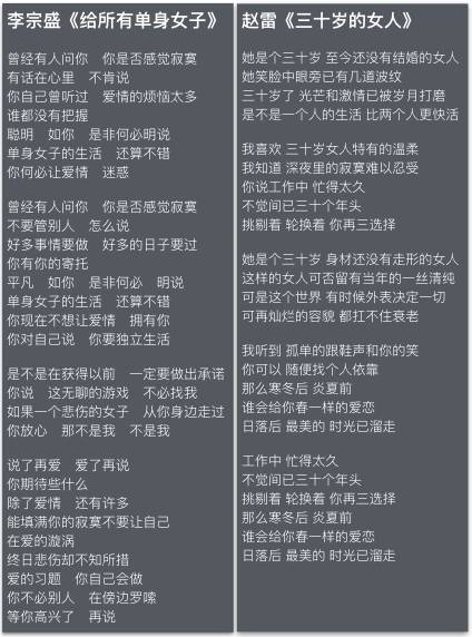 扯白||是谁给了赵雷怜悯三十岁女人资格?纷争不断的《我是歌手》,返场的民谣歌手赵雷拿出了他的压箱底的作品《三十岁的女人》。 ▲请特别注意观众和其他歌手的表情…… 这首歌呢,简单地说,就是一个男屌丝写的劝嫁歌,语气是这样的: 你呢,是个三十岁还没嫁出去的女人,眼晴旁已经有了几道皱纹,也没有了当年的情纯,幸亏身材没有走形,你为什么要坚持独身呢,难道真的一个人的生活比两个人更快活,别硬撑了,你晚上一定很寂寞吧,年纪大了,还是别再那么挑剔了,随便找个人嫁了吧,因为再灿烂的容貌都扛不住衰老…… ▲找来这首歌的MTV,片子拍得很文艺很唯美很煽情,但歌词第一句就让人觉得不舒服——三十岁还没结婚咋了?三十岁的女人就老了吗? 不听则已,一听我真的被气笑了。 因为这和我在北京饭局上碰到的老男人的话语简直一模一样,看来普天下一无所有的男屌丝的话语体系都一样,泡妞的姿势也一样,他们挂着关心的羊头卖着泡妞的狗肉,那猥琐又鸡贼的笑容后面透露出独属于中国男屌丝的独特的价值观: 首先:女人在婚恋市场上最大的价值是年轻、身段和清纯。 其二:三十岁还没有嫁出去多么可怜啊,性生活一定很缺乏吧,需要哥给你暖床吧。 其三:别太挑了,年纪都这么大了,随便找个人嫁了就得了…… 一首歌的诞生毫无疑问浸透着创作者的三观。 我们以李宗盛同样的题材为例 ,看看这两者之间有何区别: 两者我们可以很明显地看出: 首先:赵雷身处的环境比较芜杂 确切地说所处的环境比较底层,而这首歌的创作背景,用他的粉丝辩解的话就是他写这首歌是当年在酒吧驻唱时看到很多晚上不回家的三十多岁的女人,“那时看着台下的人她们笑、她们哭、她们闹”,所以他写了这首歌。 从社会学来讲偏底层的男性更容易以年龄与外表去判断一个女的价值。 ▲科普一下赵雷的背景:1986年出生于北京一个做小买卖的普通家庭,读书时爱上了唱歌,17岁(2003年)开始在北京的地下通道唱歌,后来去了后海的酒吧当驻唱歌手,但因不喜欢酒吧的环境(他觉得那里的人根本不懂音乐也听不懂他在唱什么),2007年时开始去拉萨一边流浪一边歌唱,足迹遍布陕甘云藏,行走中创作了不少“流浪”作品,例如《开往北京的火车》、《咬春》等 。2010年参加《快乐男声》选秀进入了20强但不被评委赏识;2014年以民谣歌手身份参加另一个选秀节目《中国好歌曲》却凭一曲《画》获得评委刘欢老师“无可挑剔”的高度评价;今年2月,作为补位歌手参加湖南卫视《歌手》第三期,演唱歌曲《成都》突围成功。 其二:赵雷对女性的认识比较单一 你看,李大师笔下的单身女子有一些关健词: “生活还算不错”、“聪明”、“独立”、“无聊的游戏不必找我”、“高兴了再说”…… 而赵雷笔下的单身女子的关健词是什么呢? “眼角有了波纹”、“身材没变形”、“三十岁女人特有的温柔”、“挑剔”、“衰老”、“孤单”…… 基本上,李大师对单身女人的评价是正面的,而赵雷对单身女人的评价是负面的,唯一表扬了一下30岁女人还有温柔。在他的世界里,这也恐怕是三十岁女人唯一赖以生存和嫁人的武器了,直男的脑洞也是真大啊…… 这种情况有两种可能:一种就是赵雷见识少,没见过聪明独立活得还不错的单身女人;一种就是赵雷选择性失明,在他眼里只有“眼角有了波纹”、“身材没变形”、“挑剔”、“衰老”、“孤单”的单身女人。 如果是前者,那应该多出去走走,多看看世界,多接触接触人;如果是后者,其实就是内心阴暗负面,一生专注黑大龄女。 其三:赵雷对女性的态度非常不友善 李大师也说了单身女人的寂寞,但他的态度基本是正面的鼓励的: “曾经有人问你你是否感觉寂寞,不要管别人怎么说,好多事情要做,好多日子要过,你有你的寄托”,“除了爱情还有许多能填满你的寂寞”,“爱的习题你自己会做,你不必别人在旁边啰嗦”…… 而赵雷是: “这个世界有时候外表决定一切,再灿烂的容貌都扛不住衰老”,“你可以 随便找个人依靠 那么寒冬后 炎夏前 谁会给你春一样的爱恋”…… 我不知道赵雷受过女人什么样的伤害,以至于他要冷冷地写出这些恶毒的话,在这首歌里我甚至看不到什么怜悯(当然怜悯我们不需要),只有一个一无所有的男人对于长得还算漂亮的大龄女青年敢于弃他而去而发出的诅咒。 我们常说,对于前度的处理方法,代表了一个人的最高人格以及度量和格局,一个年轻的男人,对于离去的恋人,没有依恋,没有感伤,只有刻骨的讽刺和贬低,甚至还要借着性别优势,用那套最低俗最落后最封建的男女观去打击对方,以期待她明天能够回来,这难道不是智商情商双双掉穿底线的表现么? 这让我想我大学时隔壁班的一个满脸青春豆的男生,因为没有追到校花,他就到处造谣说她改了年龄整了容——改了年龄整容了也跟你没关系,年过三十眼角有了波纹也没有关系,我唯一能说的是写出这样词来的创作者心理既不健康,情商又低,见识还少,这样的歌还当成压箱底的宝贝,也还真是情何以堪。 怎么说呢? 赵雷的男女观,大概和天佑喊麦的人没有区别,代表了最普遍最底层的男性们对待大龄女性的普遍看法,年过了三十你还牛什么牛…… 虽然他们自己一事无成,但是他们仍然可以借着年龄打击女人——他们强烈的优越感的唯一来源就是他们是男人: 因为他们是男人,所