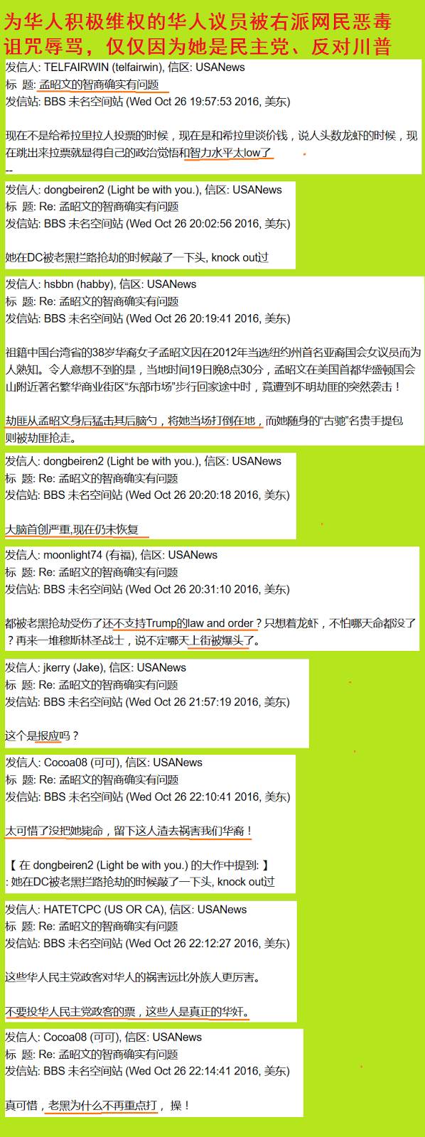 后大选时代,论华人不团结的根源文/ 月如钩 华人的不团结一直都是司空见惯,毫不新鲜。然而去年大选,更是把华人的分裂推动到极致。不但挺川挺希两派势同水火,挺川华人内部也是恶斗不止。一些华人之间的政治立场分歧,更是一步步加深直至演变成难以化解的私仇。大选之后,华人社区普遍厌倦纷争,渴望团结。但是,怎样才能完成团结华人的艰难任务呢?难道单单靠美好的愿望和激昂的口号就可以吗?难道建一个微信群,把几百人拉进去,喊几句慷慨激昂的口号 “大选结束了,华人要团结!”、“没有川粉希粉,我们都是华人!”,然后群友们队形一致地 “+1”、 “+2”、“+100”,再发上一大堆竖起大拇指的表情图,点上一百个??,华人团结就实现了? 有那么简单吗?如果那么简单,华人团结岂不早就实现了? 正是因为美好的愿望不能掩盖残酷的现实,激昂的口号也不能抹平社区的裂痕,我们必须放弃一厢情愿,实事求是地剖析华人不团结的根源,从而吸取过去的教训,找到促进团结的方案。任何社会现象,都必定有其因果。我们要问:到底是谁,用什么样的方式,造成了大选以来华人空前严重的不团结呢? 要分析华人社区的分裂是怎样一步步愈演愈烈直至发展到现在的样子,就必须追根溯源,从大约三年前讲起。2014年,以加州的SCA-5事件为导火索,华人社区掀起了一场所谓 “选党不选人” 的运动,把加州的民主党政客尤其是其中的华人政客全都一棍子打死。事情并不到此为止,而是打击范围逐步扩大,这场运动从加州扩展到整个美国的华人社区。不但民主党政客被攻击,普通华人左派民众也遭殃。一些华人共和党人求胜心切,因为事实不够有力,就用谎言来打击敌人,大肆制造舆论对华人左派进行扣帽子和造谣抹黑。过去的三年里,诸如 “左x”、“屁精”、“龙虾党” 等对华人左派的侮辱性称呼以及 “华人左派是人渣,是汉奸,是犯罪分子” 之类的言论也听得人耳朵都起了老茧。至此,原本的通过暂时倒向共和党防止特定法案通过的选举策略,已经异化为一些华人共和党人为谋求上位长期造谣诋毁不同政见人士、欺骗华人选民的政治工具。 在舆论宣传上,过去三年,华人右派霸占论坛版面,并开动微信公众号,大量散发虚假新闻和偏激言论,不择手段地攻击华人左派。本人甚至遇到过网络上的华人右派,刚刚鹦鹉学舌学会了喊几句政治口号,就信口雌黄造谣说本人支持种族主义。事实上,当年本人开始参加华人反歧视维权的时候,这些“火线参政”的人恐怕连民主党和共和党都分不清呢。 大选期间,通过肆无忌惮的造谣对川普的吹捧和对左派的抹黑更是达到极致。微信上以 “Civil XXXXXX” 和 “XX华人之声” 为代表的挺川公众号,频繁推送大量造谣文章,其中不乏低级下流者。为了政治宣传,还不惜肉麻吹捧Steve Bannon、Milo Yiannopoulos等极右种族主义分子,赤裸裸地鼓吹白人至上思想。这些挺川宣传,还辅之以对特定人群的恶毒攻击,因为他们需要给读者制造一个敌人。事实上,华人当中也有非法移民、穆斯林、同性恋者,更有很多穷人。但在右派眼里,显然这些华人是被开除了 “华人” 资格的。 华人右派经常批评华人左派对弱势群体的同情,说他们有所谓的 “道德优越感”。但事实上,真正有道德优越感的是华人右派,他们对左派的侮辱性言辞里富含的道德贬低就是明证。大选前微信上流传一篇文章 “给希拉里支持者的一封公开信”,颇有某法弟子的文风,里面通篇道德谴责,甚至连 “人在做,天在看” 都喊了出来。况且,华人右派的优越感,何止是道德优越感,还有人格优越感呢!在他们眼里,只有他们自己才是人、是华人,而被他们攻击的那些华人群体则不是华人、甚至根本不是人,恨不得将华人左派赶尽杀绝。一个活跃在微信上的华人川粉,甚至写了一篇文章,鼓吹要对左派进行肉体消灭,这篇文章赢得大量川粉喝彩,还被包括一些挺川领袖在内的不少人转发(为了给领袖们留点面子,截图就暂时不发了)。 讽刺的是,近期的一件华人维权事件,为华人呐喊的民选官员中,职位最高作用也最大的几位,却都是民主党人,包括一位被华人右派骂了整整三年的华人民主党联邦众议员。报道这个案件并引起美国社会关注的,也是他们大选期间一直在骂的 “假新闻” 主流媒体,而不是像Breitbart这样的极右媒体和那些发布希拉里的下流谣言的小报。 大选结束,标志着华人政治的一个阶段的结束,本应该回顾这一段历史,总结经验教训。但每当有人写文章总结大选中华人社区的一些现象,即使所使用的素材和论据都是真实的,但只要揭露了一些川粉的不良言行,就会引起大量对号入座者的攻击甚至谩骂,“破坏华人团结” 的大帽子也扣了上来。 试问,团结的基础是什么?南非废除种族隔离之后为什么要强调 “真相与和解”?因为真相是和解的基础,任何不要真相的和解都是耍流氓。当寒冬来临,刚刚咬过人的蛇喊了一声 “咬人结束了!动物界要团结!”,就钻到洞里冬眠去了。那些愚蠢的人,享受了一个动物界 “团结” 不咬人的冬天,但当来年春暖花开时,又被苏醒过来的蛇狠狠咬了一口。 凡是不要真相、不分是非的和稀泥式的华人团结,必定都是昙花一现的假团结。过去三年,不少华人左派曾经抱着天真的幻想,强迫自己暂时忘记曾经遭受的造谣诋毁,与打着 “团结” 旗号的华人右派试图共谋华