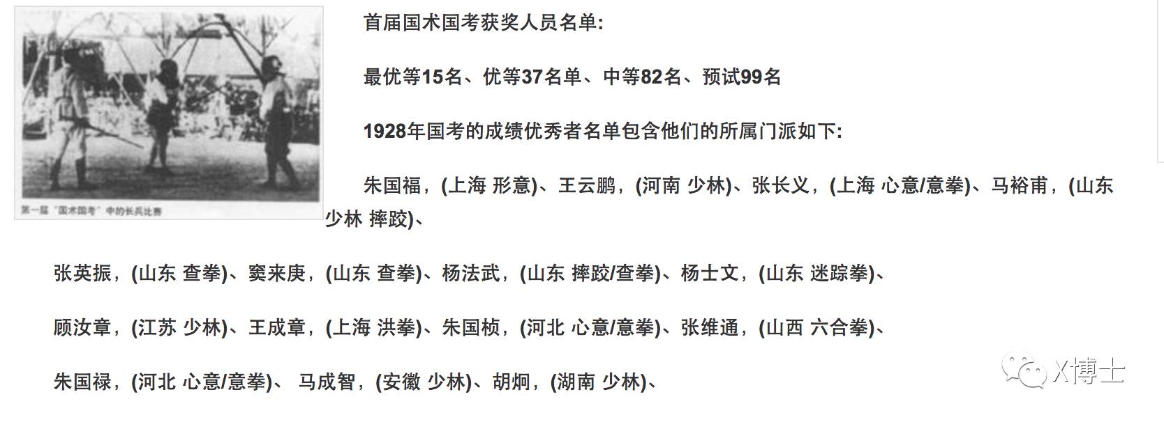 徐晓冬一定输白日鼠白胜,歌川国芳绘,1827。图片来源:x博士工作室藏 最近我在欧洲待了小半个月,在国外不怎么上网,也听说中国武林的腥风血雨了。武术上一次这么受关注那是30年前的事了,而这次徐晓冬挑战各门派是中国武术的巨大危机。大家就一个关注点:中国武术到底有没有说的那么玄,到底能不能实战?但我觉得这次比武闹到现在,真正的决胜点不在擂台上,而在擂台下,比得不是拳脚而是手腕了。在这基础上,徐晓冬输定了。 1 江湖一直是权力的游戏 中国武术中,最玄的就是太极拳。 太极拳地位高,并不是因为实战结果好。事实上从清末开始,太极拳就根本没什么实际战绩。民国时期的两次国术大考,在获胜者的名单中,你很难看到太极拳的影子。 国术大考优胜者资料 之所以太极拳有名,是因为其义理最玄虚,受权力加持最大。 建国后,1950年,刚刚46岁的开国元勋任弼时就因病去世了。任弼时的早逝在党内高层震动极大,中央由此开始了对高干养生保健方面的重视,加强了运动养生,在各种武术、运动中选来选去之后,钦点了太极拳为老干部修炼的养生功法。为什么呢?因为太极拳运动量小、动作缓慢、上手简单、又杂糅了传统哲学思想,很对老干部那种既不流汗又能颐养天年的胃口。 所以当时,一大堆太极拳名家被招到元老家里辅导练功,基本就是传授一些站桩、呼吸心法和简化的套路,但是这些元老岁数都大了,各项机能状况都不佳,稍微伸展一下肢体,的确感到又精神了。像刘少奇、叶剑英、贺龙、陈毅、何香凝、江青都练习太极拳养生。到了1950年代中后期,北戴河专门建立了一个气功疗养院,在那里专门给政府要人、共和国功臣教授太极拳和气功治疗。 而且太极拳那套玄乎其玄的理论也很对老干部们的胃口。点解?太极拳讲究慢胜快、无力胜有力、老胜弱,在正常人眼里都不合乎逻辑的事情,在一些传统武术爱好者眼里成了信奉的奥义。这套理论叭叭叭一说,一群夕阳红的老干部们,在心灵和精神上又有了回炉的空间,练了之后老干部更有力量啊,还能再笑傲江湖二十年。 所以这些离权力很近的太极拳师,隐隐约约地就有了大内高手的光环,倍受权力宠爱。 而李经梧正是在北戴河气功疗养院工作了近30年的太极拳老师,一生教过、接触过的大人物无数。而那个一碰人就浑身发麻“太极大师”闫芳就是李经梧的再传弟子。虽然说闫芳被李经梧别的学生斥为“骗子、败类”。但是我们看看李经梧的和闫芳的练功视频对比,这学生到底像不像老师,相信大家都会心里有数。