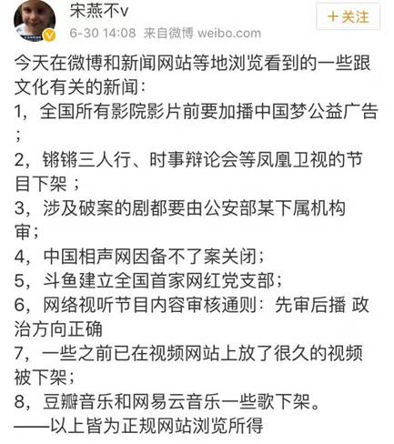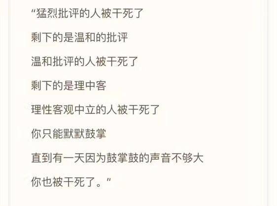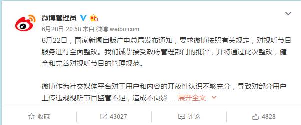微博在视听节目被责令整改之后不久,发了一条官方声明,要求未持有一类视听许可证的账号主体不可以上传时政视听节目;关闭超过15分钟以上的长视频上传功能,以及自动解析功能;加强与人民日报、新华社、中央电视台等有资质的中央媒体的内容合作,放大主流舆论的传播声音。 先不管我觉得对不对,好不好,支不支持。 您能先把评论打开吗?能把转发打开吗? 这意思是我们只有看的权利,没有说的权利;你们有说的义务,没有听的义务? 想想A站都整改了,B站还会远吗? VPN慢慢消失了,1984也开始下架了,国乒都道歉了,2017刚好过了一半。 当你问“这个世界会好吗?”的时候,沉默不会给你答案和未来。 敢发声是每个媒体人的墓志铭,不抗争是给予卑鄙者的通行证。