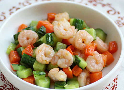 虾仁 300克、黄瓜 1根、胡萝卜 1根、淀粉 1/2汤匙、色拉油 适量、食盐 1/2茶匙、料酒 1汤匙、白胡椒粉 1/2茶匙、香油 1茶、姜 1小块 1、虾仁清洗干净,去掉虾线,加入盐、料酒、白胡椒粉,少许淀粉抓匀让虾仁上浆,腌20分钟左右 2、胡萝卜和黄瓜洗净切小丁,姜切成末备用,锅中加入色拉油,油热后下入姜末爆香,下入虾仁滑炒 3、虾仁变色后盛出,锅中留底油,油五成热将胡萝卜丁下锅炒至断生,放入事先炒好的虾仁 4、放入黄瓜丁翻炒均匀,出锅前淋入香油,即可