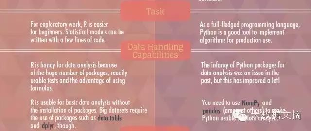 按任务类型划分,做探索性研究时,R语言很适合初学者。几行代码便可写出统计模型;而作为一个完整成熟的程序语言,Python是为产品使用进行算法执行的一个工具。