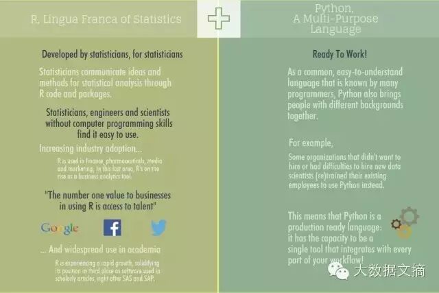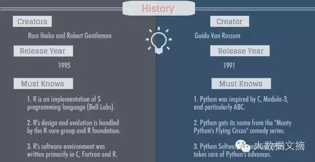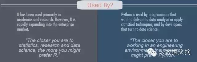R语言是Ross Ihaka和Robert Gentleman于1995年开发的,作为贝尔实验室S编程语言的一种实现,其开发环境主要由C语言,Fortran和R来完成。Python的发布年份其实远在R之前。Guido Van Rossum于1991年开发完成了Python,并由Python软件基金会(PSF)负责其发展。其开发灵感主要来自C语言和Modula-3,部分来自ABC语言。Python的名字取自喜剧蒙提·派森的飞行马戏团(Monty Python's Flying Circus)。 从定位角度看,R致力于提供更好的,对用户友好的数据分析、统计分析和绘图模型;而Python则强调生产效率和代码的可读性。 双方的用户群也有一定的差异。R主要用于学术和研究领域,如今正在快速拓展其企业市场的运用。Python的使用者,是那些想深入钻研数据分析或者应用统计技术的程序员,以及向数据科学寻求帮护的开发者。用一句话总结:“越接近统计研究跟数据分析人,越倾向R;越接近工程开发工程环境的人,越倾向Python”。 R和Python都得到大量的社区支持,包括邮件列表(Mailing Lists)、用户贡献的文档、以及Stackoverflow网站。此外,R还可以从研究人员、数据科学家、统计学家和数量分析专家那里得到更多的支持;而Python则从开发者和程序员那里得到的支持。 从实用性来讲,R通过几行代码就可以写出统计模型,尽管R有样式表,但并不是每个人都使用它们,可以用若干种方式写出同样的功能。在Python中写代码和调试代码则更容易一些,主要是因为它的“优美”语法。但是代码的缩进会影响它的意思。并且,在Python中,永远只有一种方式来写同样的功能。