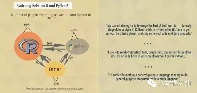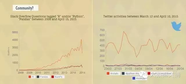 从整体数据来看,在做数据分析时使用R的人数要多于使用Python(下图左:2014用于数据分析的程序语言)。在2014年,有23.45%的人同时使用R与Python(下图右:2014年R和Python使用分析)。 在2008-2014年5月之间,Stack Overflow上问题标签是”R” 和/或 “Python”、“Pandas”的数量,R明显领先。在2015年3月12日到4月10日之间,在twitter上统计rstats, python numpy, python pandas和numpy这几个关键词,活跃度最大的是rstats。
