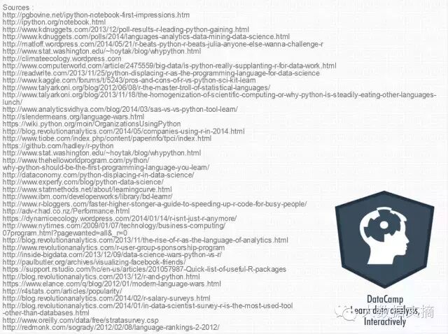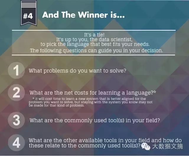 #4 那么赢家是…… 最后的结果是平局!哪个工具更适合,取决于你这个数据科学家如何去挑选一个最适合你需要的程序语言。下面的问题可以指导你做出决定。 1.你要解决什么样的问题 2.你学习一门程序语言的成本?学习一个能更好地解决问题的新系统会花费时间,但依旧使用你熟悉的系统并不能解决你要解决的问题。 3.在你的领域最常用的工具是什么? 在你的领域中还有什么可用的工具,它们和那些常用工具有什么关系?