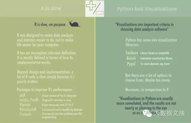 现在来比较一下两者的优缺点。R最大的优点在于其作图能力,俗话说,一图抵千言,相比单看原始数据,可视化后的数据能被更高效、更有效的理解。利用ggplot2 可以绘制优美的图表,使用图表算法创造图层、定制图表;lattice易于展示多变量关系;rCharts从R中建立、定制和呈现交互式Java可视化;googleVis利用Google表格工具在R中可视化数据;用ggvis对一个网页浏览器进行渲染时,可以实现图像的交互式语法,例如在R中可视化Facebook好友。