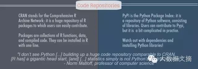 计算机科学教授Norm Matloff 曾说过,“Python并未建立起一个能与CRAN媲美的巨大的代码库,R在这方面领先巨大。但是,统计学并不是Python的中心任务。”