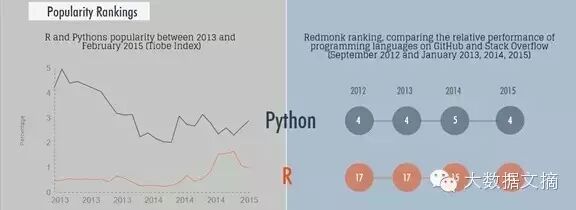 以上,从定性的角度进行了比较。现在,看看双方的定量数据。小二,上数据! 先看人气排名,下图左边为2013-2015年2月R和Python人气比较(Tiobe指标),右边为Redmonk排名,它比较了GitHub和Stackoverflow上编程语言的相对性能。