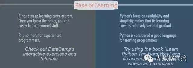 关于易学习性,开始学习R时有一个陡峭的学习曲线,一旦了解了最基本知识,就能很容易地学习更高级的知识。因此,对于有经验的程序员,R并不难。建议R的学习者查看DataCamp上的练习和教程。
