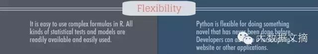 在灵活性方面,在R中使用复杂的公式很容易。各种各样的统计检验和统计模型都是现成的并且容易使用;相比R,Python在完成以前没有做过的新奇的事情上,很灵活,开发人员也会用它写网站或其它应用的脚本。