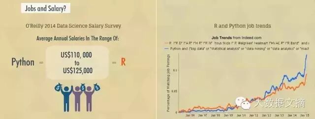 工作和薪资方面,O’Reilly 2014数据科学工资调查显示,R和Python平均年收入范围都是11万美元到12.5万美元之间。Indeed.com上R与Python的工作趋势显示,Python的工作需求量高于R。 现在很多人都选择同时使用R和Python。有的策略是利用两种语言最好的部分——初始分析在R语言中进行,在需要更严格的分析、团队工作或者发布代码和数据产品时开始转换到Python。有人是用R进行统计检验、画图和检查大数据,必须写算法时,则更倾向于用Python。也有人说,更倾向于在通用语言中做数学计算,而不是用数学语言进行通用编程。 [建议]选定语言只是万里长征第一步。如果你想要成为数据科学家,推荐你看一篇受欢迎度很高的文章“天龙八步:8步让你变成数据科学家”(点击查看)。
