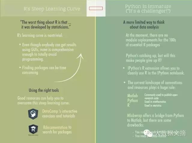 因为由统计学家开发,R另一个缺点是它陡峭的学习曲线。尽管任何人都可以使用GUI得到结果,但没有人能够完全避开写程序,并且找程序包很花时间。你可以通过使用正确的工具解决这个问题,利用以下这些资料可以帮组你克服这个陡峭的学习曲线:包括DataCamp上的练习和教程和上Rdocumentation搜索程序包。