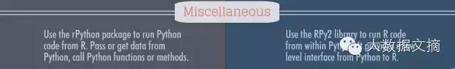 其实R与Python并不是完全孤立的,在R中用户可以通过rPython包运行Python代码,从Python传递或获取数据,调用Python函数或者方法。而在Python中也可以使用RPy2包运行R代码,这提供了一个从Python到R的底层接口。