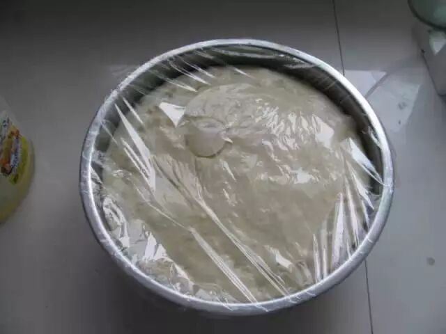 待面和的差不多了,用手蘸油把面揉好,就这样,用保鲜膜盖好,等待发酵。