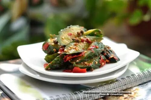 原料:黄瓜、红辣椒、精盐、生姜、麻椒、白醋、熟芝麻