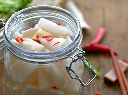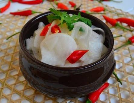 原料:白萝卜 700克、盐 6克、辣椒 2根、冰糖 30克、白醋 50克。