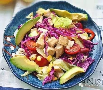 原料:鸡胸肉、牛油果、紫甘蓝、圣女果6颗、玉米50克、生菜、柠檬1个、食盐、橄榄油2勺、红酒、胡椒粉、蜂蜜、迷迭香。做法: 1.柠檬皮擦丝,鸡胸肉放盐,红酒,胡椒粉,柠檬皮,柠檬汁腌制,倒橄榄油,放烤盘中,洒柠檬皮,迷迭香,180度烤15分钟; 2.牛油果切片,沙拉菜洗净放入大碗中,半颗柠檬挤出汁,混合一大勺橄榄油,一勺蜂蜜,调匀; 3.烤好的鸡胸肉切成小块,放入沙拉碗,倒入沙拉汁拌匀。