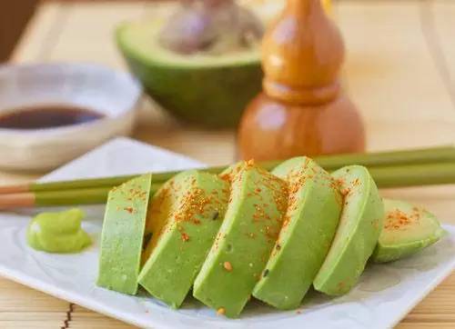 五. 牛油果+芥末+酱油(三文鱼的味道哦) 1. 牛油果切成两半去核,用刀横向划开切成小片。 2. 装盘后淋一些酱油,撒上芝麻装点,吃的时候配合一些芥末口感更好。牛油果瞬间变身三文鱼的口感!
