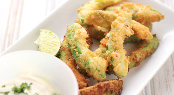 2. 取一个大碗,准备适量小麦粉和胡椒海盐混合,均匀包裹在浸过蛋液的牛油果条外。 3. 油锅加热后小心地将牛油果条放入,炸至金黄后取出沥干油分即可装盘。吃的时候可以配一些色拉酱或蛋黄酱。