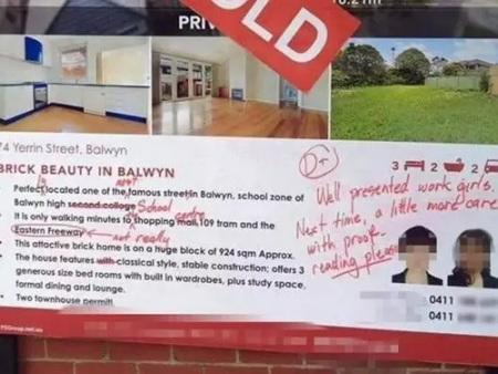澳大利亚一家华人地产中介发布英文广告牌,因错误连篇令一位匿名“语法控”忍无可忍,用红笔将错误全部标出并给出犀利点评。这张图片被网络疯传。