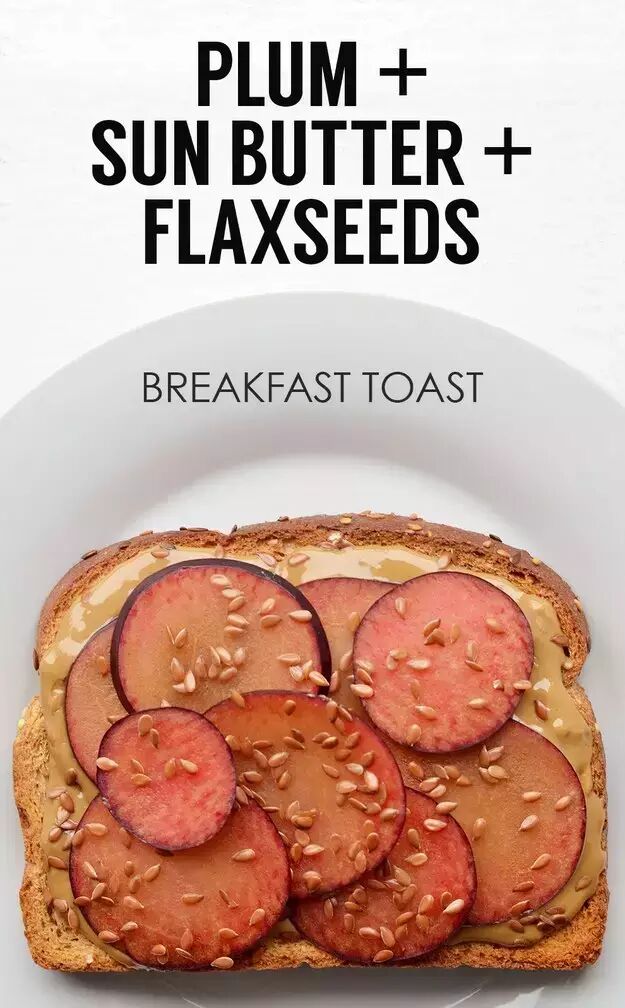 葵花子奶油(Sunflower Seed Butter)铺底,放上李子切片再撒上亚麻籽,这一道看起来就好可口。
