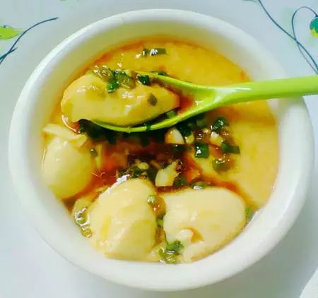 做法: 1)鸡蛋+少许盐打散 2)加入适量清水拌均匀 3)加入适量清加入快溶化的猪油拌均水拌均匀 4)所有材料搅均匀后倒入蒸碗里 5)把蒸碗放入蒸蛋器中,插电开始蒸 6)6分钟左右蒸好,取出 7)把葱切碎+少许生抽调下 8)调料倒入蒸好的蛋上即可