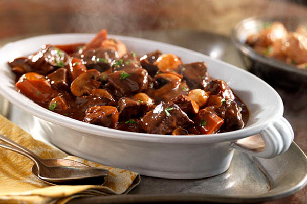 红酒炖牛肉(Beouf Bourguignon)是勃艮第的传统菜肴,用红酒烹煮牛肉,加以蘑菇、洋葱、胡萝卜和培根等辅料,酒香浓郁,咸鲜醇厚。