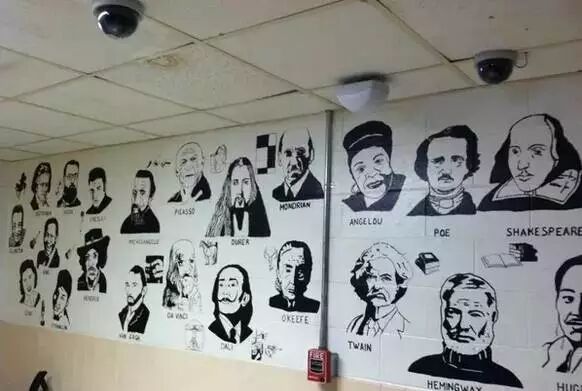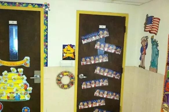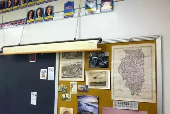 例如下面这个是某中学政治老师的教室。美国中小学的政治课,不是讲什么奥巴马思想克林顿主义,貌似是讲总统和政府部门的历史。