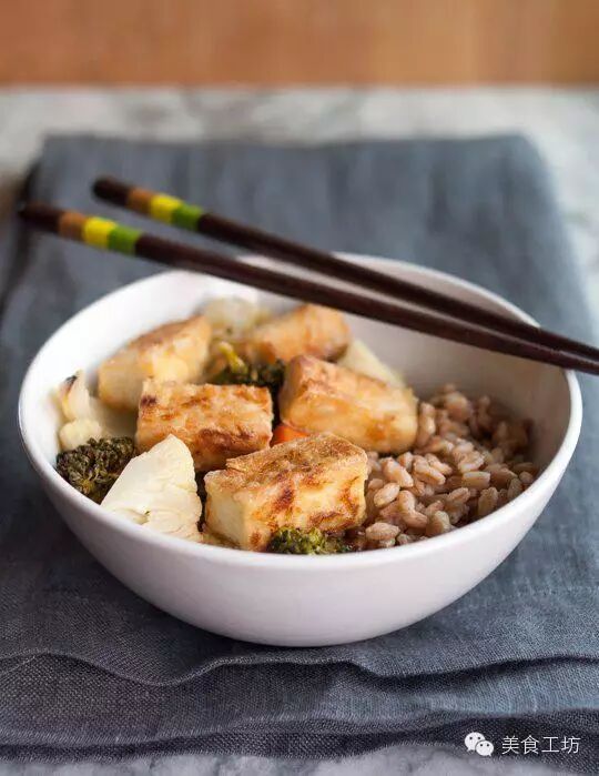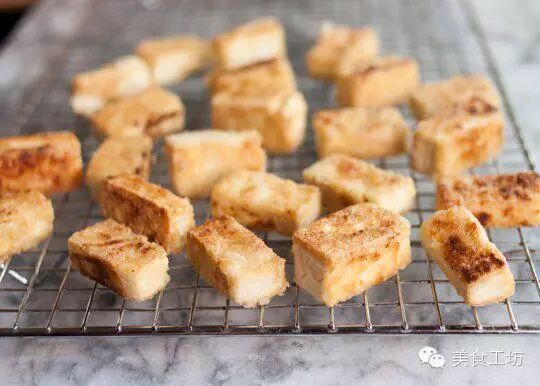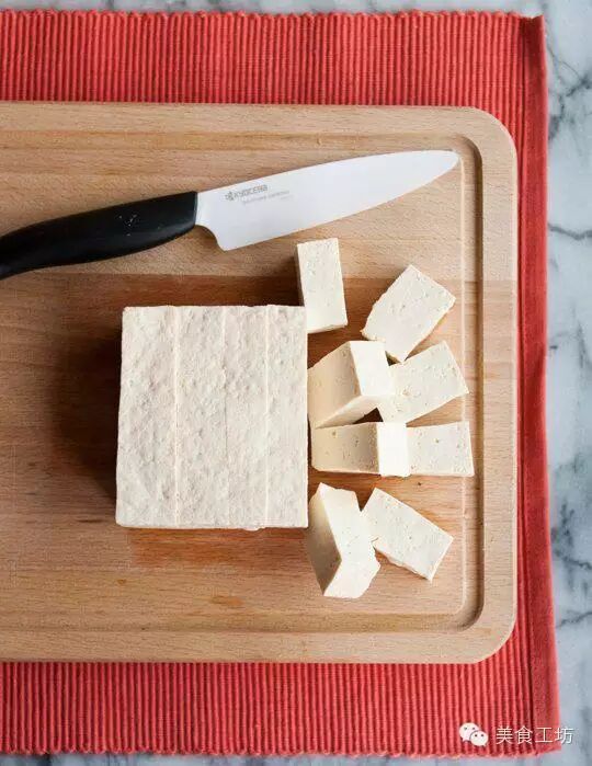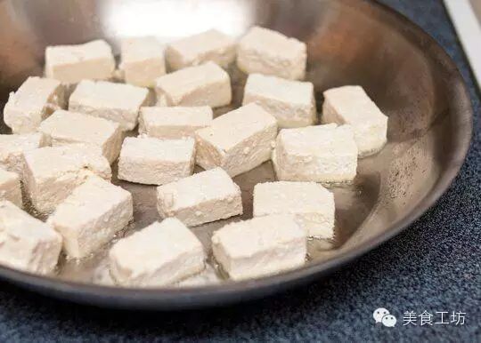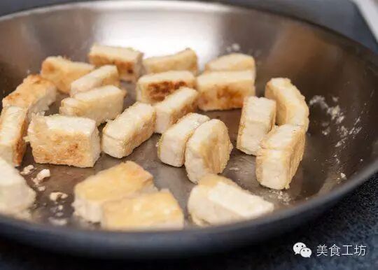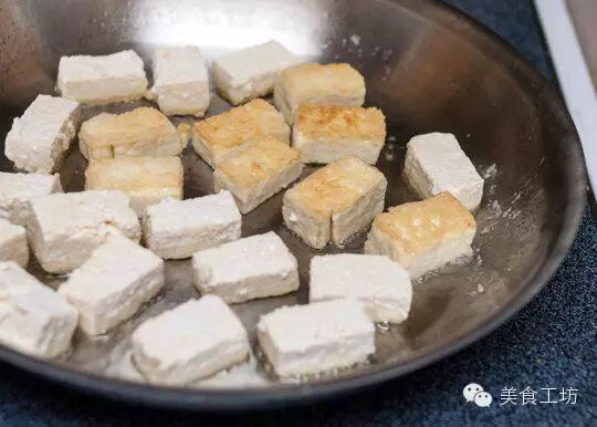 8开始豆腐会粘在锅上(除非你使用不粘锅),等到豆腐脱离锅底就翻面,翻过来的一侧应该是金黄色的。