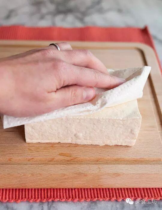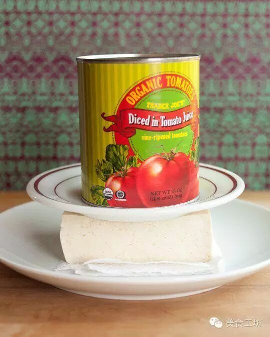 1取出豆腐,盘子上放一块折叠纸巾,小盘子放在豆腐上面,然后上面放一个一斤半到两斤的重物,压15至30分钟。