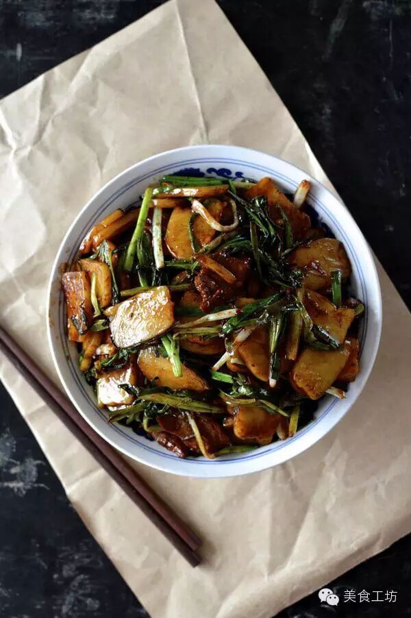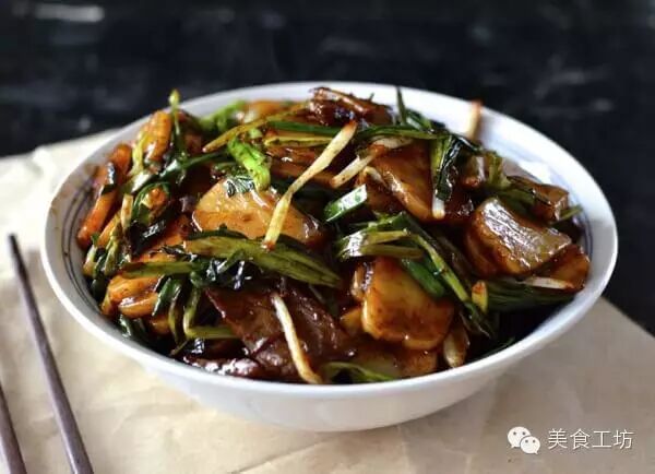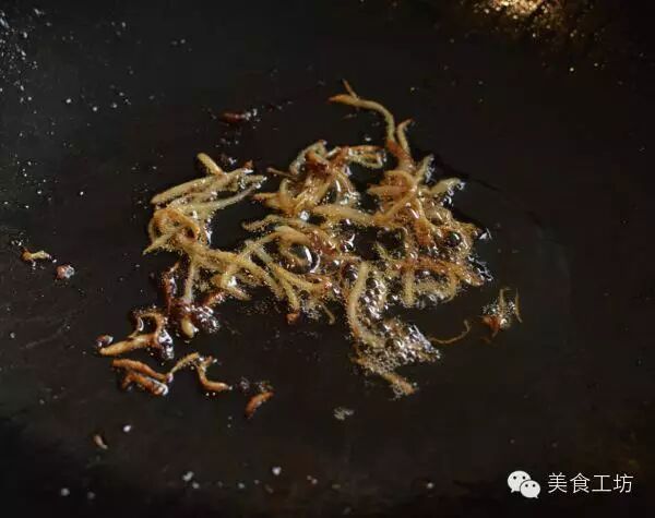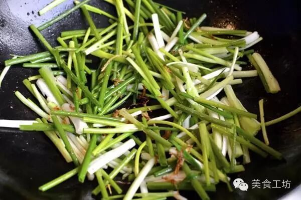 2当生姜丝片颜色成棕色后,再加入大葱爆炒。
