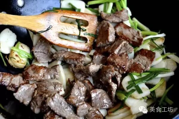 1将牛肉放置在1大匙油,玉米淀粉和1茶匙生抽中腌约15分钟;在锅中加入2汤匙油,加热,待油锅高温冒烟,放入生姜丝片。