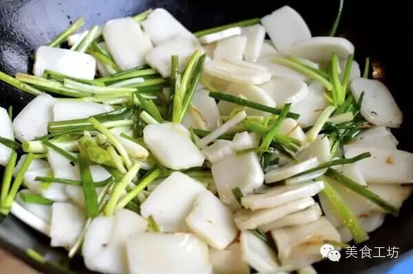 5翻炒几分钟,待年糕口感变软并有嚼劲即可。若没有,盖上锅盖,再煮会儿。
