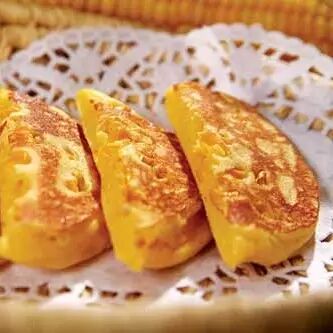 【南瓜饼】 原料:老南瓜、糯米粉、粳米粉、豆沙、生白芝麻、白糖。 做法: 1. 老南瓜洗净,切块蒸熟,加入适量白糖,搅拌均匀。 2. 加入糯米粉和粳米粉,比例是4:1,用筷子搅拌下,揉成南瓜团。 3. 取适量南瓜团,搓成长条,切成大小差不多的小段,取一小团,揉圆,再用手轻轻按扁,挤入豆沙,再揉圆,轻轻再按扁。 4. 在做好的南瓜饼坯上刷上一层清水,放入芝麻堆里,正反面都粘上芝麻。 5. 锅内倒适量油,油5成热时,放入南瓜饼坯,中火煎至两面金黄色即可。