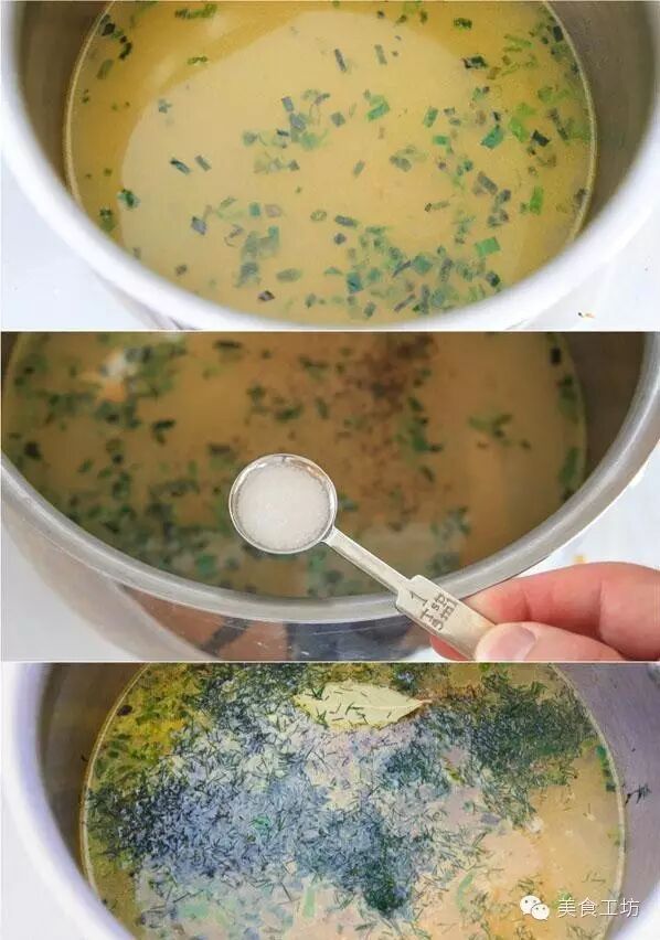 2加入6杯鸡汤,加盐、胡椒粉、莳萝和月桂叶。