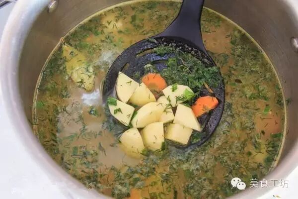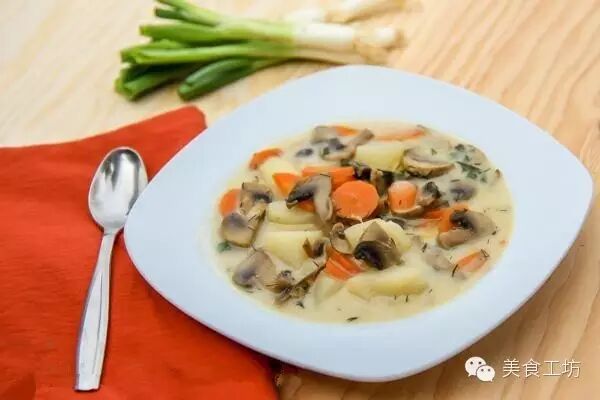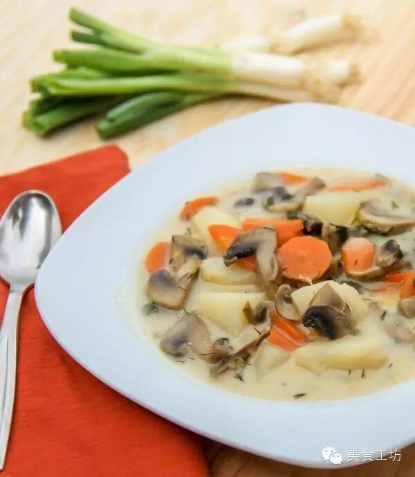 4到5个土豆(去皮,切块) 1斤蘑菇(切片) 1杯奶油 2个胡萝卜(切片) 1小茶匙黑胡椒 6杯鸡汤 1小杯面粉 3汤匙黄油 2汤匙油 2茶匙莳萝 1片月桂叶 适量盐 葱