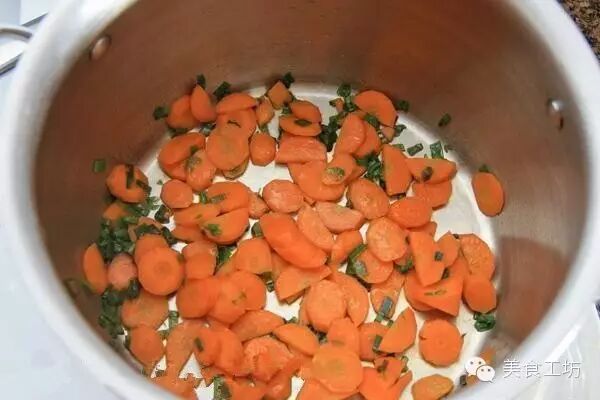 1锅开火,倒油,放入胡萝卜和葱炒5分钟,炒到胡萝卜变软。