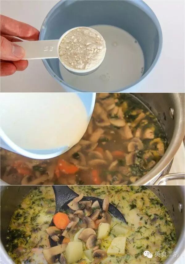 51小杯面粉和奶油碗中拌匀,慢慢倒入汤锅里,煮沸。