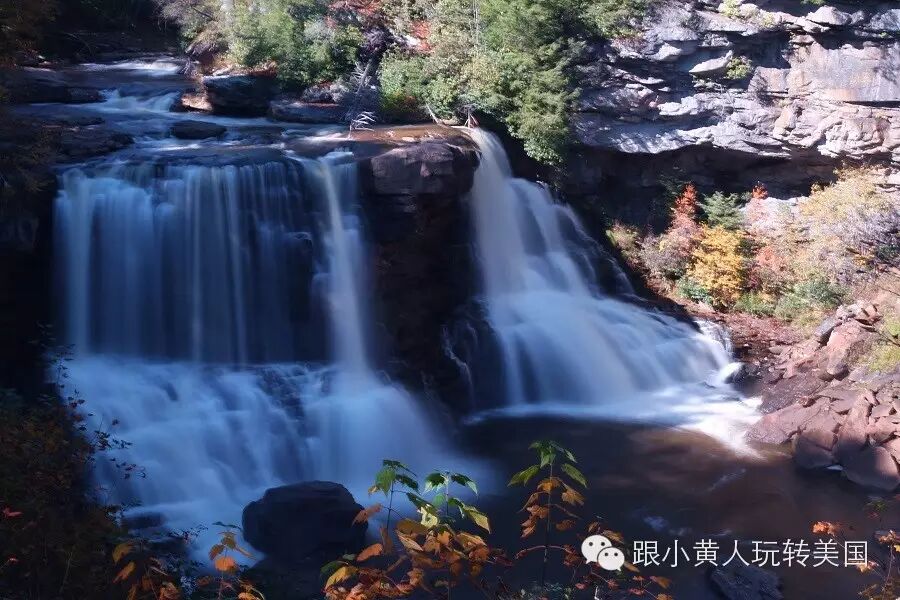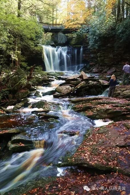 公园还有两个瀑布,一个叫做Blackwater Fall,在停车场停车之后,沿着一个非常简单的木板trail往下走即可,trail极短极容易,3-80岁游玩都没有问题。瀑布不算高,65 feet,水也不是特别清,可惜的是这个瀑布周围的树种没有红叶,只会变黄。