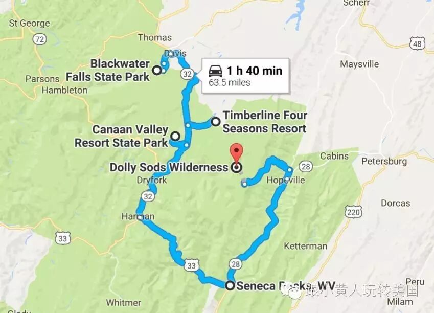 此地的五个主要旅游景点的位置关系如下,由于可以写的东西很多,该攻略分为三篇,上篇着重介绍老幼咸宜的三个赏秋地点,Timberline Four Seasons Resort,Canaan Valley Resort State Park与Blackwater Falls State Park,这三个地方对体能要求比较小距离较近周末可以一并玩过,为红叶的主要观赏区,而且均有住宿。中篇为摄影爱好者介绍Dolly Sods Wilderness以及从马州和维州方向来两个可以选择经停的摄影地点,下篇为大家介绍Senaca Rocks hiking,中篇与下篇下周发送。
